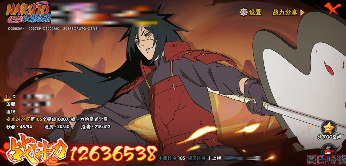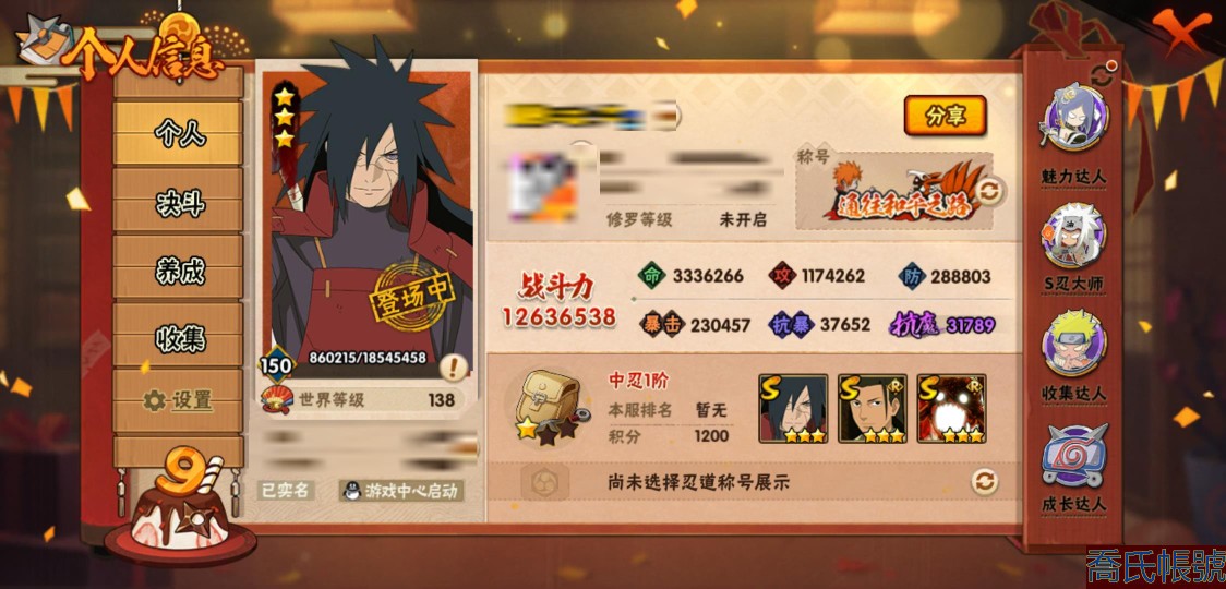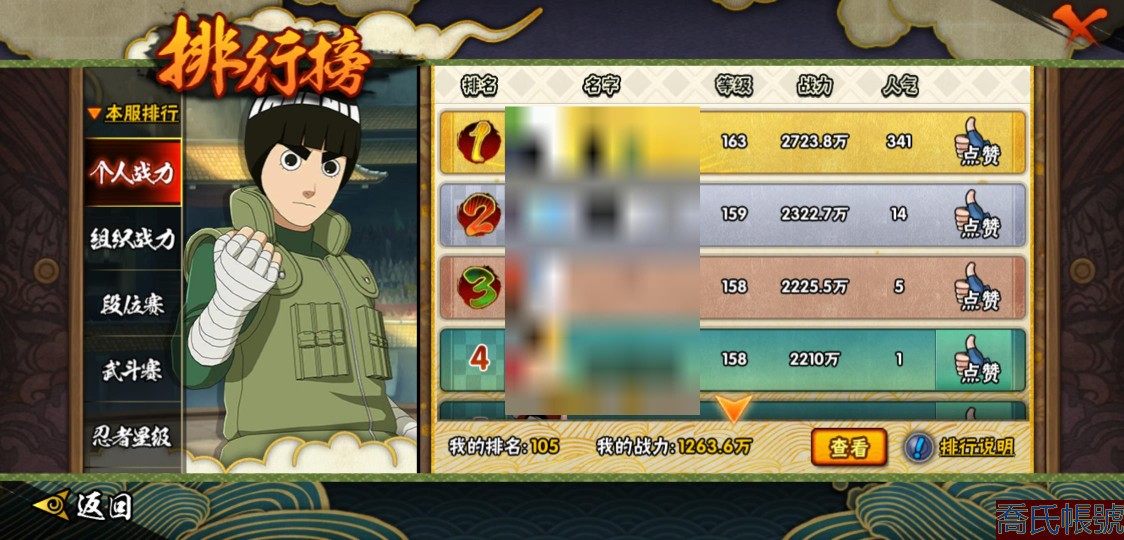 【11等】戰鬥力:1263W+;段位:中忍1階;本服排名:105;戰區排名:未上榜;V