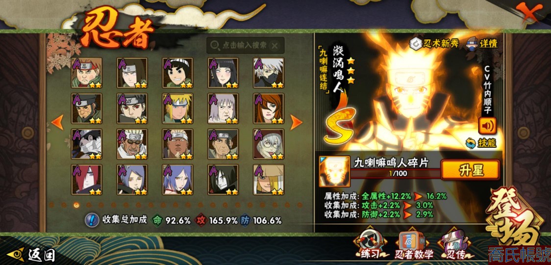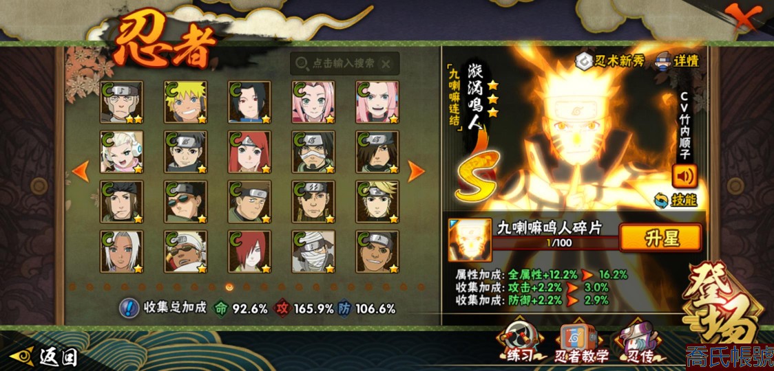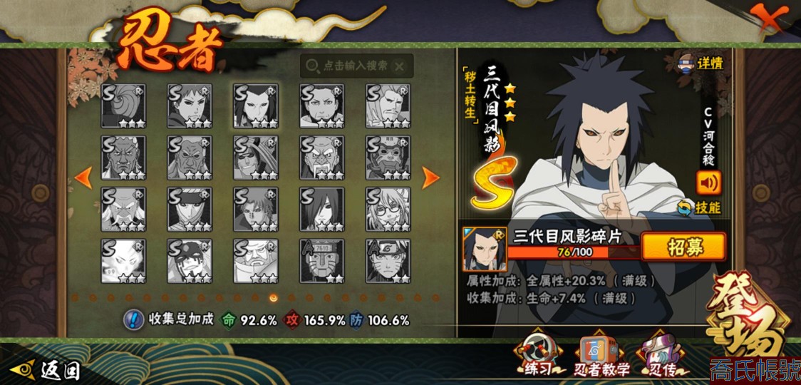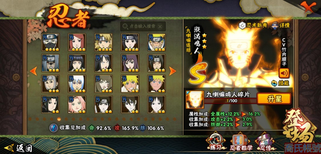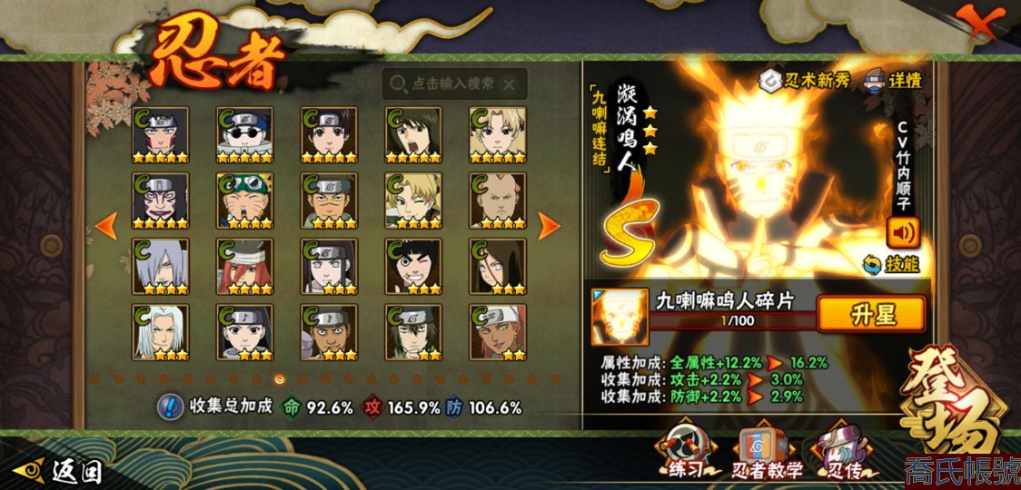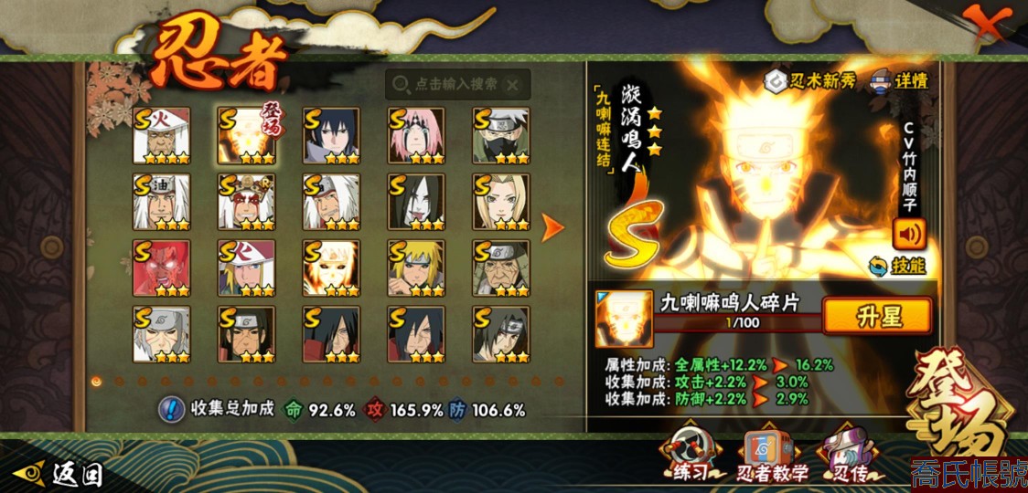 【OBHLLHW445142】戰鬥力:1583W+;段位:上忍1階;本服排名:61;戰區排名:未上榜;VIP9級;S忍27個;A忍39個;通靈獸19個;S忍:猿飛日斬(4星),九喇嘛連結漩渦鳴人,永恆萬花筒宇智波佐助,忍界大戰春野櫻,須佐能乎旗木卡卡西,自來也,舞之豪傑自來也,傳說中的三忍自來也,大蛇丸,綱手,死門邁特凱,波風水門,九喇嘛連結波風水門,穢土轉生波風水門,穢土轉生猿飛日斬,穢土轉生千手扉間,穢土轉生千手柱間,穢土轉生宇智波斑,穢土轉生解宇智波斑,須佐能乎宇智波鼬,穢土轉生宇智波鼬,須佐能乎宇智波止水,白面具宇智波斑,忍界大戰宇智波帶土,紅夜之刃神秘面具男,忍界大戰艾,天道佩恩;A忍:邁特凱(5星),猿飛阿斯瑪(5星),蠍(5星),幹柿鬼鮫(5星),疾風傳我愛羅(4星),緋流琥蠍(3星),宇智波鼬(3星),飛段(3星),桃式顯現漩渦博人(3星),九尾查克拉漩渦鳴人,萬花筒寫輪眼宇智波佐助,須佐能乎宇智波佐助,宇智波泉奈,忍界大戰秋道丁次,忍界大戰日向寧次,忍界大戰李洛克,最終章日向雛田,萬花筒寫輪眼旗木卡卡西,穢土轉生猿飛阿斯瑪,宇智波止水,青年波風水門,近松十人衛千代,五代目水影照美冥,穢土轉生桃地再不斬,奇拉比,青年艾,忍界大戰土臺,半蛇斗篷藥師兜,青年長門,小南,漂泊浪客小南,曉大蛇丸,迪達拉,穢土轉生迪達拉,死司憑血飛段,猿飛木葉丸,六代目水影長十郎,五代目雷影達魯伊,四代目土影黑土;通靈獸:忍犬,藍蛇,蛤蟆吉,忍龜,砂之守鶴,鐮鼬,猿魔,山椒魚,蜃,蛤蟆仙人,鮫鯊,蛤蟆健,烏鴉,蛤蟆龍,蛤蟆廣,夢貘,蛞蝓,鷹,蜘蛛;時裝:狂野鮫鯊幹柿鬼鮫,百戰宇智波鼬須佐能乎,百戰大蛇丸,桀驁之刃猿飛阿斯瑪,蜀面豪傑舞之豪傑自來也,百戰佩恩天道,百戰波風水門,太極靈韻日向花火武當宗師,傳說的光芒波風水門,血霧怪人幹柿鬼鮫,熊貓少女天天峨眉宗師,編織虛實宇智波鼬,烈土霓裳黑土四代目土影,龍的傳人李洛克截拳宗師,剎那的藝術迪達拉,飛瀑流泉長十郎六代目水影,緋櫻綻放春野櫻百豪,驚雷掠影達魯伊五代目雷影;【2451】