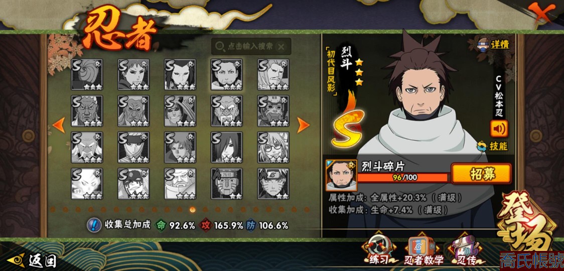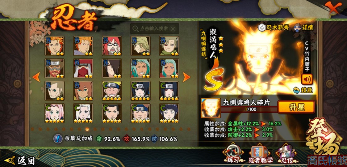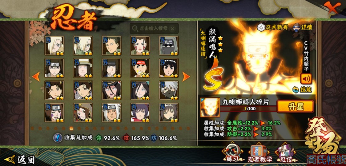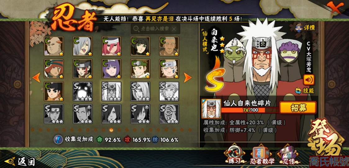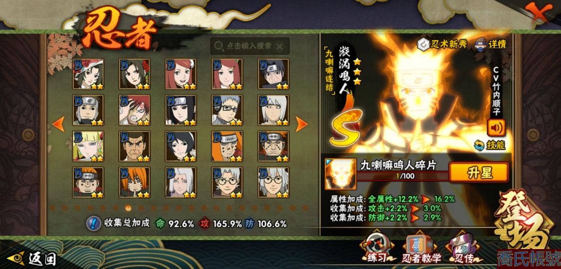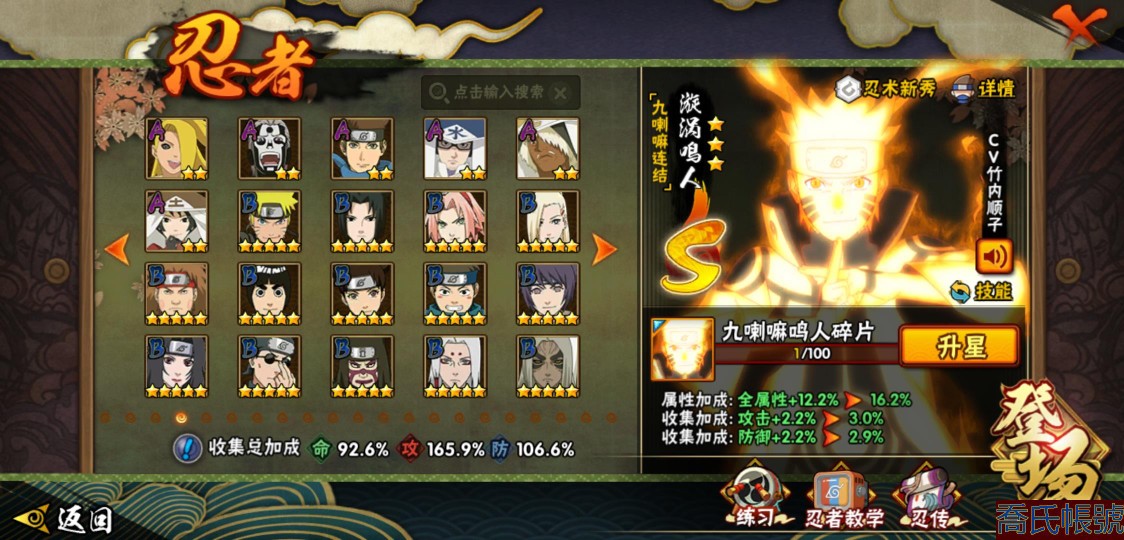 【OBHLLHW445142】戰鬥力:1583W+;段位:上忍1階;本服排名:61;戰區排名:未上榜;VIP9級;S忍27個;A忍39個;通靈獸19個;S忍:猿飛日斬(4星),九喇嘛連結漩渦鳴人,永恆萬花筒宇智波佐助,忍界大戰春野櫻,須佐能乎旗木卡卡西,自來也,舞之豪傑自來也,傳說中的三忍自來也,大蛇丸,綱手,死門邁特凱,波風水門,九喇嘛連結波風水門,穢土轉生波風水門,穢土轉生猿飛日斬,穢土轉生千手扉間,穢土轉生千手柱間,穢土轉生宇智波斑,穢土轉生解宇智波斑,須佐能乎宇智波鼬,穢土轉生宇智波鼬,須佐能乎宇智波止水,白面具宇智波斑,忍界大戰宇智波帶土,紅夜之刃神秘面具男,忍界大戰艾,天道佩恩;A忍:邁特凱(5星),猿飛阿斯瑪(5星),蠍(5星),幹柿鬼鮫(5星),疾風傳我愛羅(4星),緋流琥蠍(3星),宇智波鼬(3星),飛段(3星),桃式顯現漩渦博人(3星),九尾查克拉漩渦鳴人,萬花筒寫輪眼宇智波佐助,須佐能乎宇智波佐助,宇智波泉奈,忍界大戰秋道丁次,忍界大戰日向寧次,忍界大戰李洛克,最終章日向雛田,萬花筒寫輪眼旗木卡卡西,穢土轉生猿飛阿斯瑪,宇智波止水,青年波風水門,近松十人衛千代,五代目水影照美冥,穢土轉生桃地再不斬,奇拉比,青年艾,忍界大戰土臺,半蛇斗篷藥師兜,青年長門,小南,漂泊浪客小南,曉大蛇丸,迪達拉,穢土轉生迪達拉,死司憑血飛段,猿飛木葉丸,六代目水影長十郎,五代目雷影達魯伊,四代目土影黑土;通靈獸:忍犬,藍蛇,蛤蟆吉,忍龜,砂之守鶴,鐮鼬,猿魔,山椒魚,蜃,蛤蟆仙人,鮫鯊,蛤蟆健,烏鴉,蛤蟆龍,蛤蟆廣,夢貘,蛞蝓,鷹,蜘蛛;時裝:狂野鮫鯊幹柿鬼鮫,百戰宇智波鼬須佐能乎,百戰大蛇丸,桀驁之刃猿飛阿斯瑪,蜀面豪傑舞之豪傑自來也,百戰佩恩天道,百戰波風水門,太極靈韻日向花火武當宗師,傳說的光芒波風水門,血霧怪人幹柿鬼鮫,熊貓少女天天峨眉宗師,編織虛實宇智波鼬,烈土霓裳黑土四代目土影,龍的傳人李洛克截拳宗師,剎那的藝術迪達拉,飛瀑流泉長十郎六代目水影,緋櫻綻放春野櫻百豪,驚雷掠影達魯伊五代目雷影;【2451】