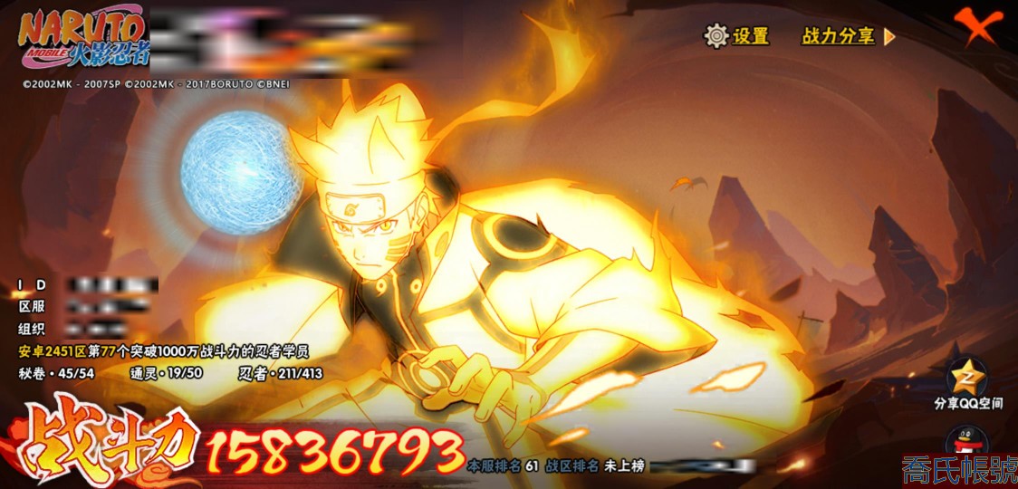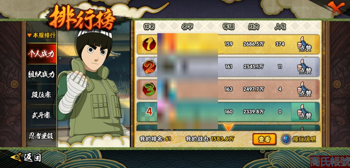 【11等】戰鬥力:1583W+;段位:上忍1階;本服排名:61;戰區排名:未上榜;VI