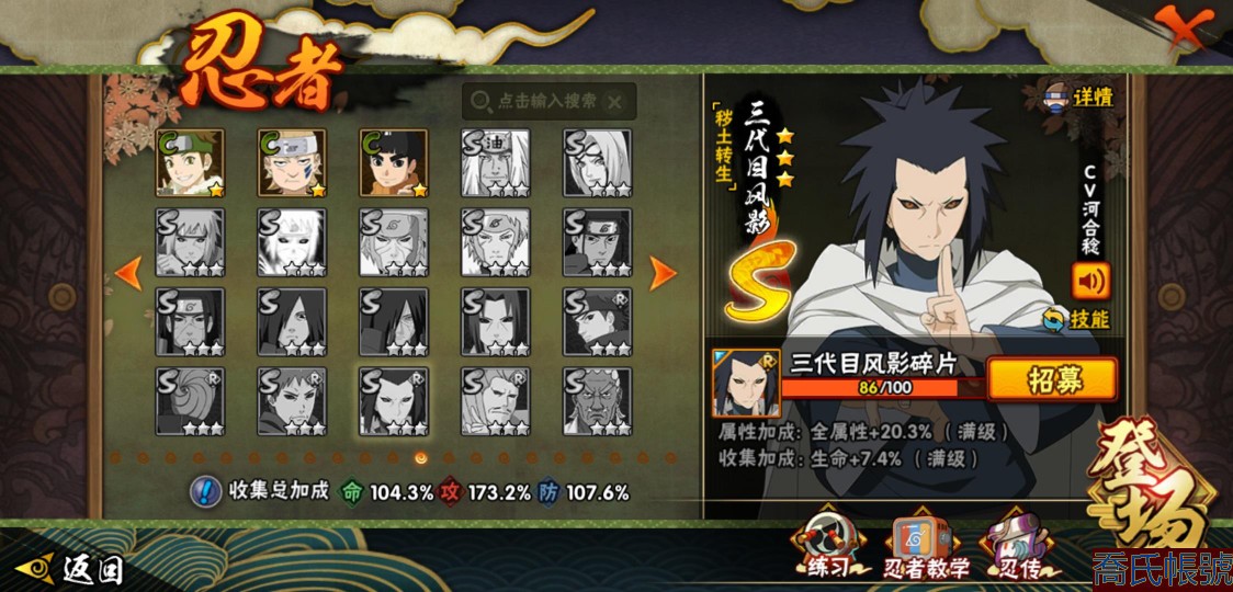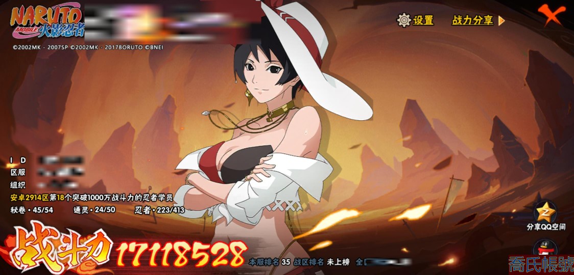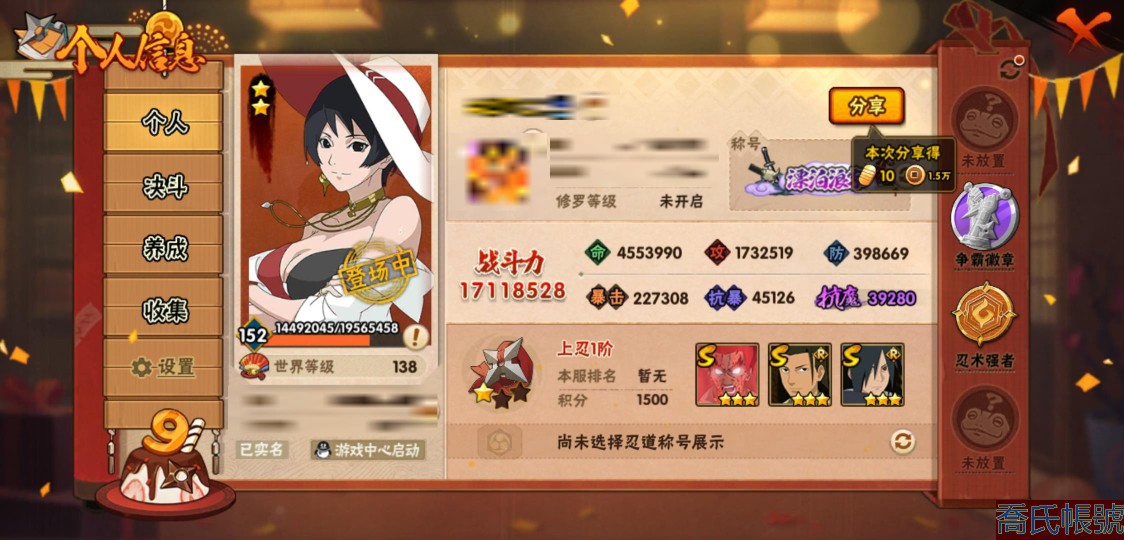 【11等】戰鬥力:1711W+;段位:上忍1階;本服排名:35;戰區排名:未上榜;VI