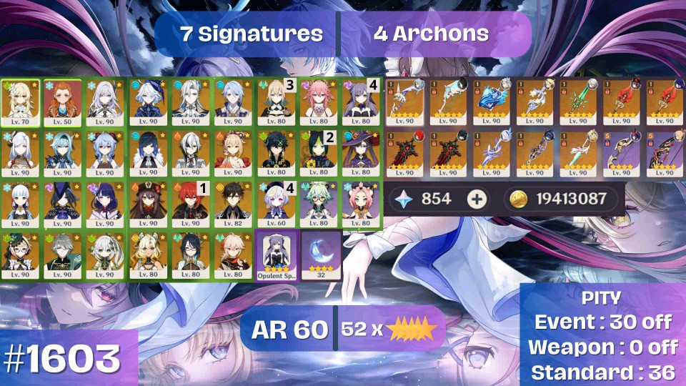 【女、60等、43金角、12金武】⭐絲科克+克洛林德+萊特+甘雨+胡桃皆專武_4命時裝刻晴_萬葉_基尼奇_艾梅莉埃