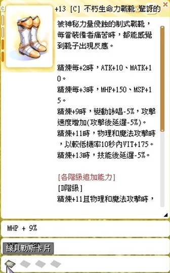+13 C階不朽生命力戰靴(附魔HP9% 插綠貝勒斯卡片 ) 請看圖