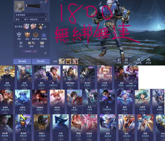 【G帳無綁無連、鑽石、無VIP、87英、29造】金幣5萬 造型20選一 英雄20選一 夢想幣5000