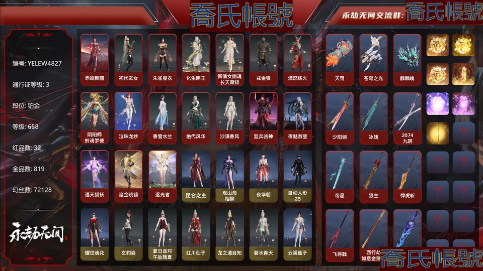【OBYELEW482742】32紅819金|等級658|鉑金|幻絲72128|金磚1420|通行證Lv.3 紅色神品:赤皓新囍,初代玄女,朱雀星衣,化生明王,新倩女幽魂·長天藏錦,戎金狼,熛怒煉火,陰陽師·蛉魂夢使,泣珠龍紗,香雪水蘭,絕代風華,沙漠香風,監兵凶神,夜魅遊瑩,通天狐襖,流金曉錦,逐光者,天罰,蒼穹之光,麒麟魄,少陽劍,冰魄,2674·九陰,帝星,狼主,悍虎斬,飛將戟,西行劫·如意金箍棒,天瓊,錦鯉玉扇,狂龍,驚百里 角色金色皮膚:崑崙之主,觀山海·相柳,夜華朝,自動人形·2B,耀世魂花,玄豹姿,夏日派對·午後瑰夏,紅川仙子,龍之道·自知,碧水青天,云溪仙子,綠野守護·悠竹萌客,楚韻九歌·山鬼,街頭狂歡·塗鴉少女,綺雲衫,觀山海·腓腓,西行劫·紫衣仙子,絮雲衣,九驪之君,武道無窮·少林,若水尊者,梨園傳奇·法海,龍之影·生死局,智繪·萍之緣,沐昭,新倩女幽魂·流紈裙,怪誕狂想·致命玩笑,怪誕狂想·紅藍狂想,怪誕狂想·街頭夢語,怪誕狂想·路奇迷蹤,怪誕狂想·友情歲月,鬥羅大陸·唐三,噬月天狼,沙狼之怒,蒼狼之主,追獵,長歌詩韻·鷓鴣天,巫師3·傑洛特,巨闕,觀山海·夏神祝融,信手斬龍,2674·街頭烈火,龍心熾焰,庖丁·食神,瑞火麟,龍之影·精武魂,逆水寒·江海滄瀾,立天地,醉山川,遊四海,P5R·芳澤霞VIOLET,長歌詩韻·遣唐使,輝燁少女,春桃笑,龍之道·至純,御宅羅夢,主祭者,陰陽姬,清雅少女,貴胄少女,決戰平安京·戀念私語,決戰平安京·朔夜遊方,決戰平安京·神罰之光,妖刀姬,綠野守護·暗沼摩羅,封神錄·敖丙,阿娜希塔,觀山海·文鰩,巨鯨客,探海裙,赤霧煙霞,夏日派對·弄潮逐浪,掌珠仙子,鎮海龍,開闢鴻蒙·金戈止,長歌詩韻·戍關將,複製體·尼爾,新魔傑·斬魔天將,西行劫·楊戩,常勝袍,百戰·破荊者,弘毅袍,龍之影·過江龍,守誓者,P5R·雨宮蓮JOKER,喜樂祥羽,黃庭道,梨園傳奇·柳生,封神錄·申公豹,司天命,幽篁山鬼,靈鹿巫者,朝聞道,玉衡天君,未濟袍,金羽客,若谷,祿運玉霄,紫微星命,封神錄·龍吉公主,藏雨閣主,金襦玉衫,夏日派對·仲夏霜華,赤丹朱湛,寒英素雪,麟鹿大鎧,蒼雷丸,千秋匠心·玉葉景,長歌詩韻·胡旋女,觀山海·青鳥,神鷹之女,夏日派對·昭夏流金,火羅聖女,瀚海蒼鷹,福瑞天澤,葫蘆兄弟·蛤蟆頭領,街頭狂歡·不敗擂主,觀山海·秋神蓐收,西行劫·悟空,行空裘,怦然心動·音律織光,羽影,封神錄·哪吒,干將莫邪,武道無窮·八極,觀山海·冬神玄冥,三麗鷗家族·酷洛米,喜緣紅線,夏日派對·赤夏悠漾,封神錄·妲己,黃昏巫主,冥淵,楚韻九歌·雲中君,夜綢袍,百戰·執金,封神錄·姜子牙,赤焰戰靈,綠野守護·山漠獰影,古冢行,盜墓筆記·越野帽衫,天虹詠,雪鈴綺歌,啟明之輝,長歌詩韻·如夢令 髮型金色皮膚:簪纓發,(挑染)泠川發,(挑染)雲霞發,百靈發,韶光發,綠野守護·嬌憨發,(挑染)千絲發,緣覺發,(挑染)白芷發,子菀發,(挑染)暮落髮,蘇木發,紫芙發,伏苓發,蒼狼宗主發,鬥羅大陸·海神發,(挑染)騰煙發,逆水寒·江海發,巫師3·白狼發,(挑染)櫻舞發,月丹發,月下香發,P5R·VIOLET髮型發,安瀾發,鯨海發,碎浪發,綠野守護·冷傲發,(挑染)羽客發,(挑染)清威發,九梁發,竹律發,P5R·JOKER髮型發,(挑染)冰羽發,冰凌發,封神錄·紅鸞星發,排霜發,閻摩發,(挑染)鳳姿發,夕鷹發,觀山海·青鸞發,翔鸞發,千秋匠心·琳琅發,(挑染)桀驁發,觀山海·天刑發,(挑染)戾君發,觀山海·冥泉發,流螢發,繾綣發,幽焰發,白鴉發,(挑染)霧灼發,古溪發,(挑染)酷洛米·雙色捲髮發,(挑染)商月發,月魄發,秀逸發,長歌詩韻·豪傑發,百戰·傲採發,封神錄·仙風發,(挑染)風吹雪發,(挑染)逐影發,(挑染)璀璨發,輝耀發,蜜語發,長歌詩韻·沉醉發,(挑染)牽雲霞發 武器金色皮膚:驚火弦,御氣弩,天牛翼,千機弩,鎮海,雨歇,狂嘯,朱雀,戲祥雲,綠野守護·雨幕,引冰落,金蠍,玉飛梭,螢火,獵獁銃,石中火,雪國禮炮,雷落,鑽山,觀山海·嘉果花,造景,墨雙戟-不歸,火羅衛,竹霹靂,龍嘯,丹鶴,凝冰魄,虎踞,爐中火,星追月,心魔,烏木弓,豹胎易筋弓,逆逢,轉輪弓,仙毫,風馳弓,青花,春水,日輝,狻猊吼,腥紅之月,蓮心劍雨,炎魔,翠影,百戰·驚鋒,醒獅,蒼雷破,無相印,綠野守護·毛乎乎,天狐,2674·超越型,琴心,亢龍,隱鋒,監星尺,西行劫·紫金寶劍,俠骨·清光引,劫燼·煉,赤霄,燭神令,降龍木,鎮魔尺,含光承影,鎏金勺,邪尾,疑夢,金玉一文字,劫燼·燎,念珠丸,雷賜,數珠丸,雷厲,白鹿,盜墓筆記·黑金古刀,燭淚,無韻,決戰平安京·夢枕,青石猊,破天,自動人形·純白約定,龍蟠,山君怒,決戰平安京·朔方之刃,雷王鋸,聽濤·強勁,龍門·開伊闕,錦鯉化龍·烙刃,惡障,聽濤,陰陽師·妖刀,闊刀-陰陽師·赤影妖刀,斷月影,麒麟牙,劫濤·潮,觀山海·朱明,西行劫·三尖兩刃刀,鎮山河,映紅鋒,光啟之矛,靈木角,藤魂,武道無窮·潛龍,觀山海·金神鉞,劫垢·堀,通天戟,長虹,雪夜·清光引,建木,凌雲志,玄鯨骨叉,擊蒼穹,白虹,糖果棍,冰輝,武道無窮·封魔,學宮之杖,倒馬棍,戒律杖,梅花簪,判官筆,刺冥,曼提柯爾之牙,橈尺刀,三更令,2674·戰慄,仙舞,化魄,華夏神兵·馬首刀,殘霄,青峰疊扇,墨絨羽扇,拳皇·舞扇,騰雲歌,耀夜流華,櫻落,千堆雪,逍遙,槐棘,夔牛槌,傲骨,月瞳,嘶風,除歲,法持,銜谷,鎮魔杵,九霄寒,降魔手,地火湧,玉矩,精武,詭月,空寒,古墓麗影·登山鎬,怨憎,武道無窮·雙蝶,無救,天威,禍忌,天之刑,絕潮汐,破重雲,隱天淵,旁通,護世四法·螭龍,劫鑄·鋒,觀山海·水衡 飾品金色皮膚:白菜頭,自動人形·埃米爾,劫杯·戰神,將星錦鯉,