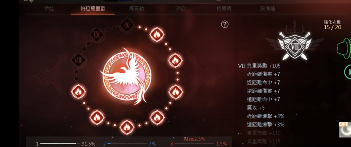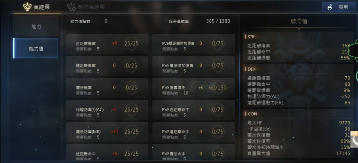 輸出:攻命172/212、防257、魔防375、減傷71、PVP減傷33、暈命22%、暈抗40%