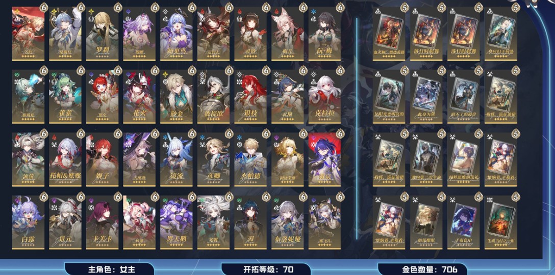 BTF3A9,開拓等級 70,103金,女主,30個五星角色,5204個星穹,5個星穹通票,5個星穹專票,28個五星光錐,22個四星角色;詳情描述【五星角色星魂階級及行跡見角色卡】