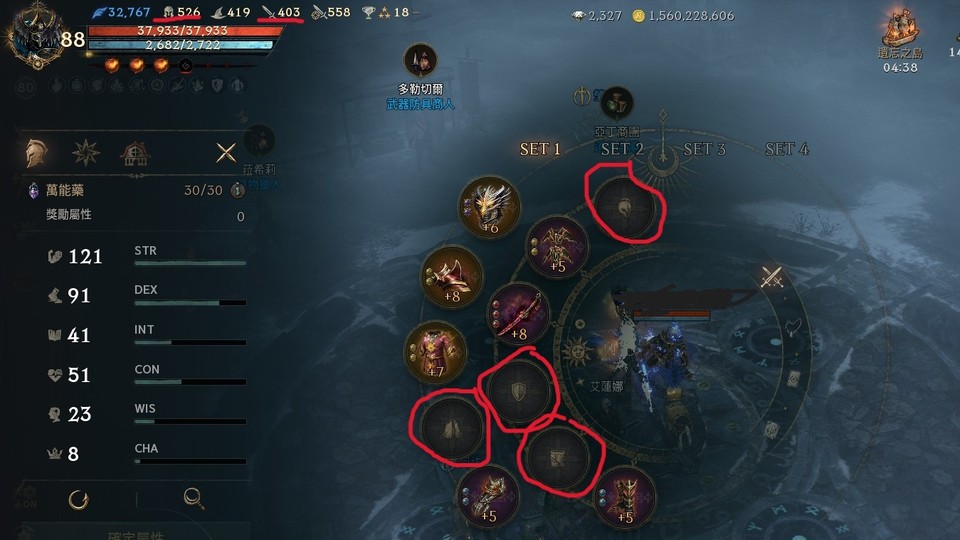 刻印紅裝:+3祝怨恨耳環(11)+2祝 裂痕耳環(11)+3祝鬥士項鏈(21)+3祝阿爾斯卡利亞戒指x2(11)(11) +3祝泰坦皮帶(21)+3祝燦爛力量符石(11)+3忍耐符石(11)+5海賊盔甲