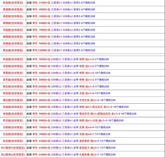 | 典藏版 (全球激活)台服 單号 80000 + 鑽三星券 x1 SSR 券 x2 自帶 2-6 个随机 SSR | ||||||||||