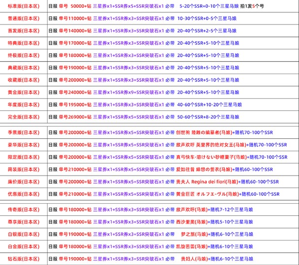 | 年度版 (日本區)日服 單號 195000 + 鑽 三星券 x1+SSR 券 x3+SSR 突破石 x1 必帶 40-60 個 SSR+10-20 個三星馬娘 | ||||||||||