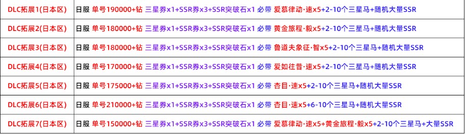 | DLC 拓展 2 (日本區)日服 單號 180000 + 鑽 三星券 x1+SSR 券 x3+SSR 突破石 x1 必帶 黃金旅程・毅 x5+2-10 個三星馬 + 隨機大量 SSR | ||||||||||