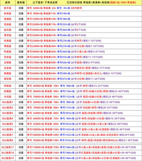 | DLC 拓展 4 | 日服 | 單號 60000 + 鑽 單抽券 750+ 單號 950 + 抽 (必帶 神罰 + 灰姑娘 + 小紅帽 + 隨機 15-30 個 SSR) |