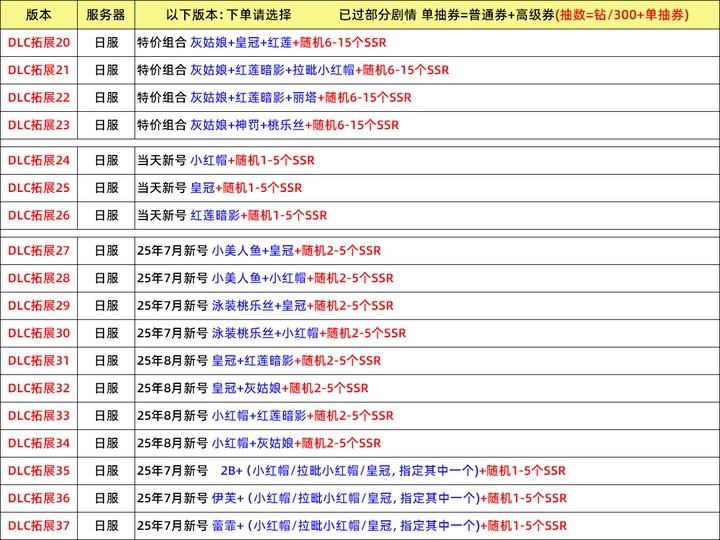 | DLC 拓展 34 | 日服 | 25 年 8 月新號 小紅帽 + 灰姑娘 + 隨機 2-5 個 SSR |