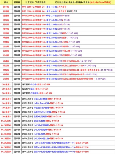 | DLC 拓展 21 | 國際版 | 25 年 8 月新號 小紅帽 + 小美人魚 + 隨機 2-5 個 SSR |