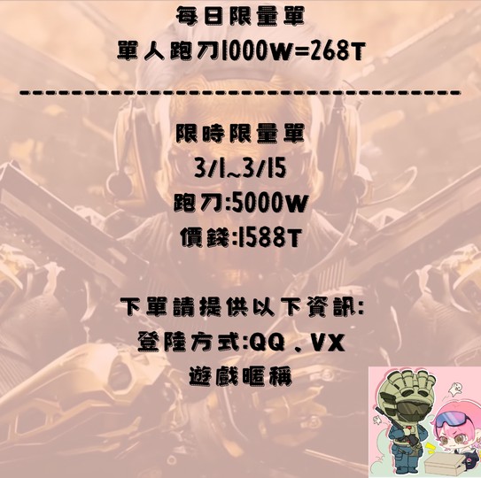 ✨若打手需重新上號,需重新掃碼,雙方時間盡可能配合,時間若無法配合,則會影響進度且延後結單,跑刀期間未結單請勿登上遊戲避免後續有爭議問題✨