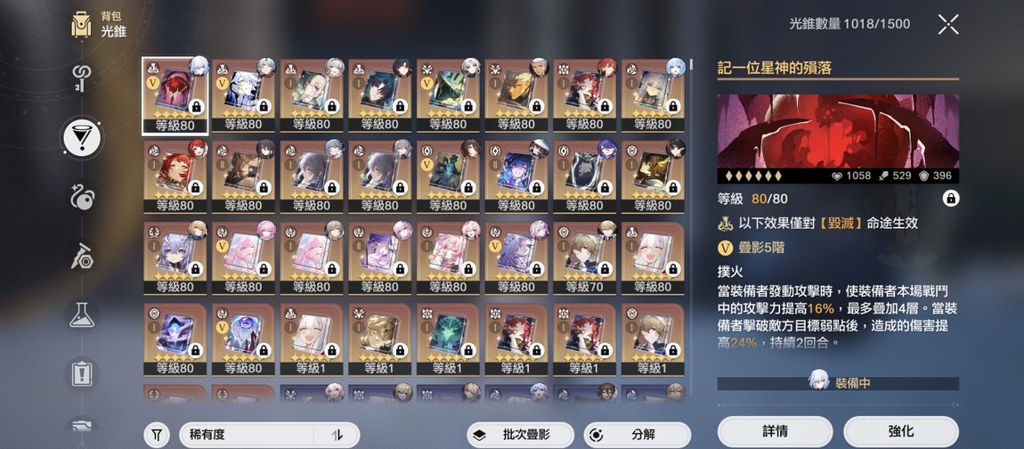 2+1流螢/2+1黃泉/2+1阮梅,其它部分都00就不打出來照片裡都有,新增6+5昔漣/6+5遐蝶/6+2長夜月/6+5白厄/2+1風菫/2+1丹恆騰荒/1+1緹寶/2+1刻律德菈/2+1紅A/6+2大麗花