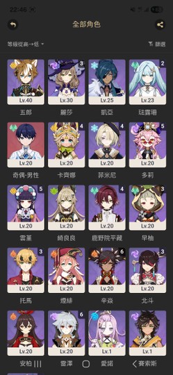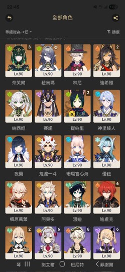 【女、60等、23金角、8金武】31奈芙01賽諾61老爺21小提20迪西亞,拉烏瑪心海草神一斗阿貝多有大月卡