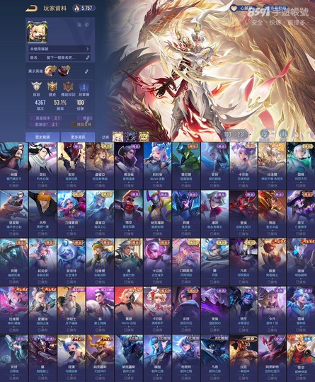 百英雄兩百多造型!共100英雄231造型!勝率近54%!!共3次S傳說戰場印記!!常用奧義皆已齊全!!
