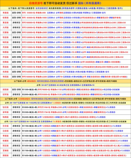 | 以下版本:拍下默認發直登號 如需游客綁定 請先聯繫客服 (所有版本都帶 大量聯動服裝 / UR 裝備 / 希望粉塵 / 三星招募券 / 金幣) | ||
