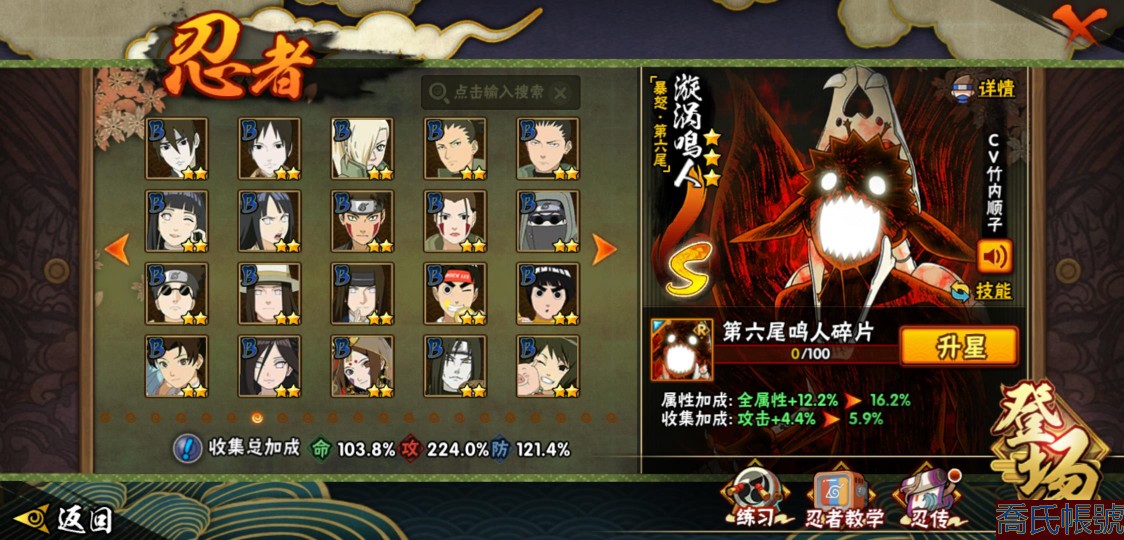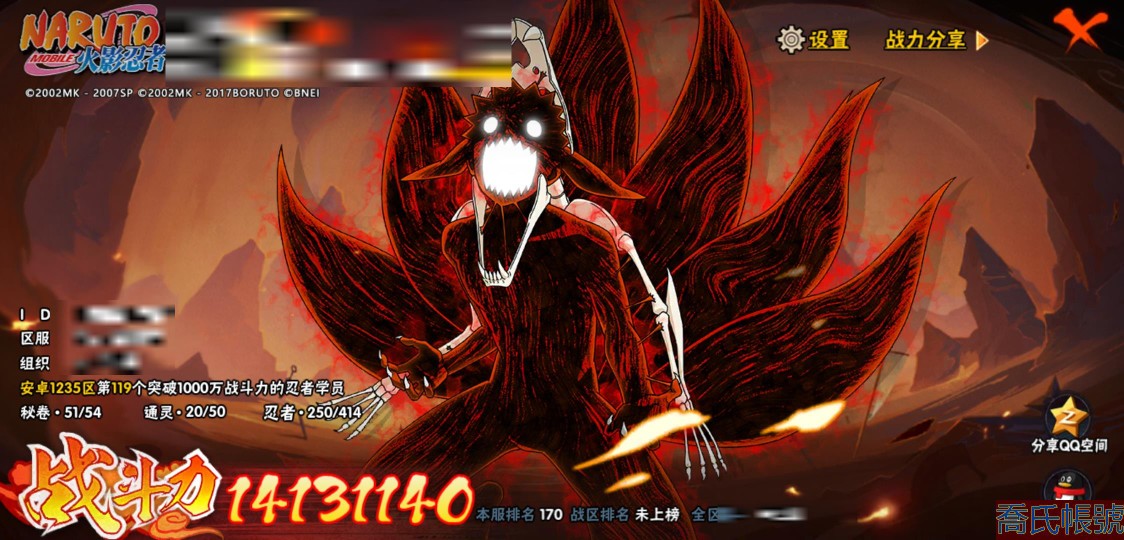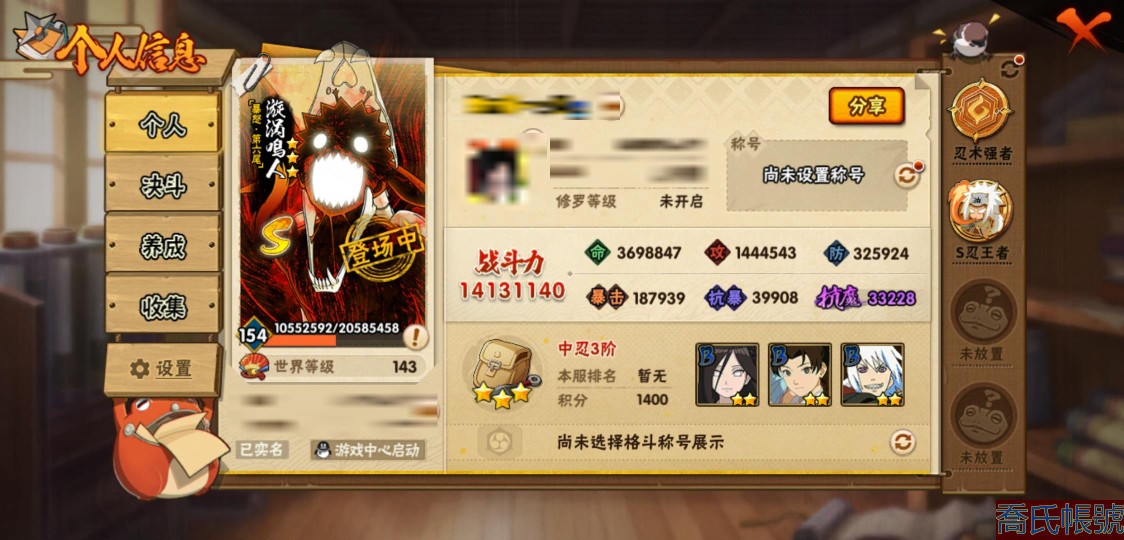 【11等】戰鬥力:1413W+;段位:中忍3階;本服排名:170;戰區排名:未上榜;V