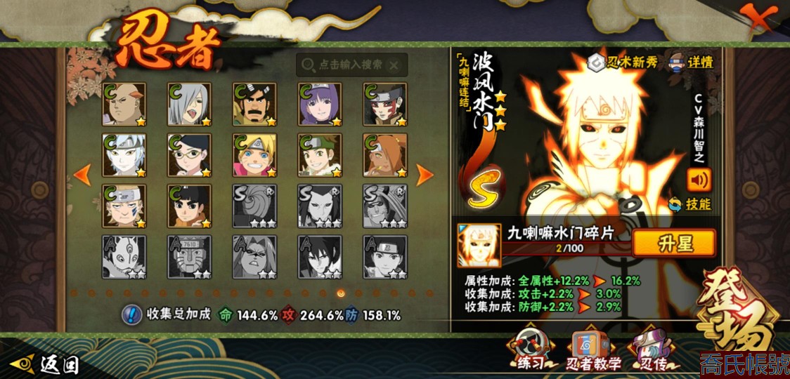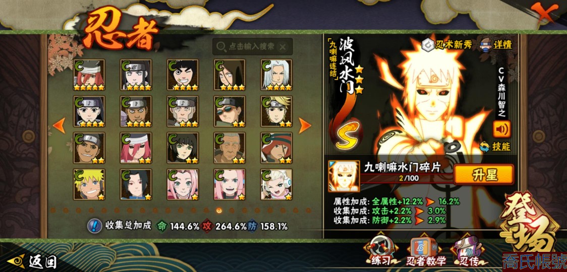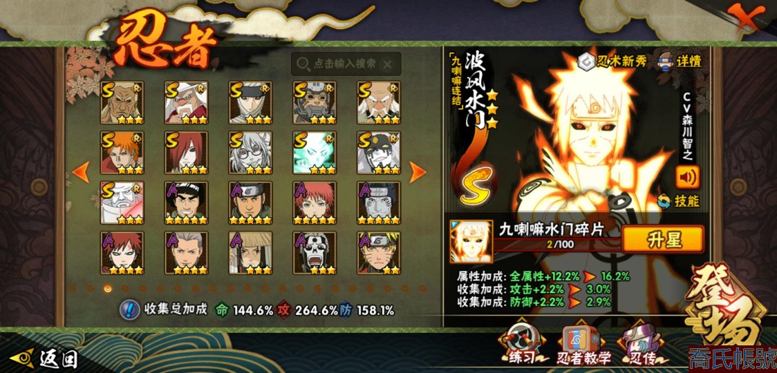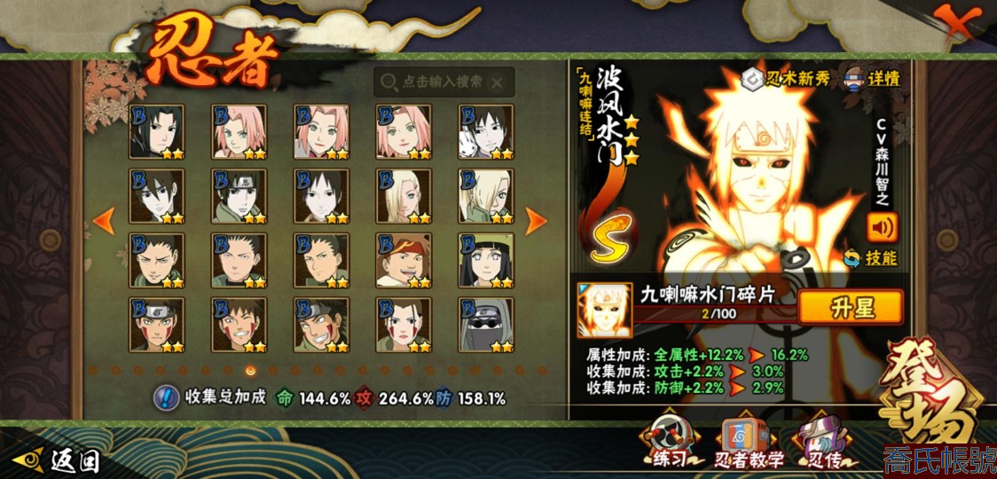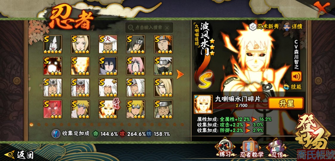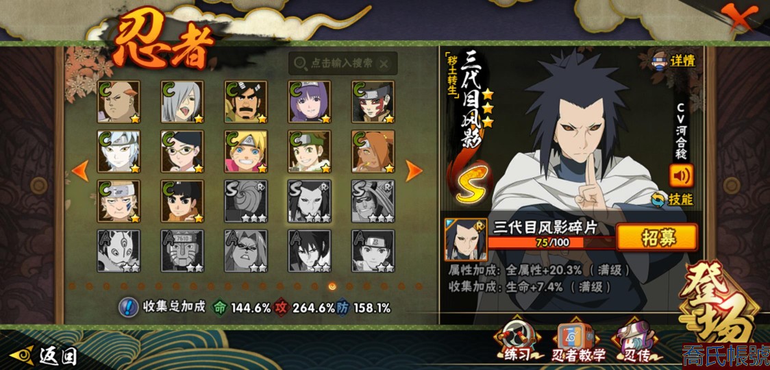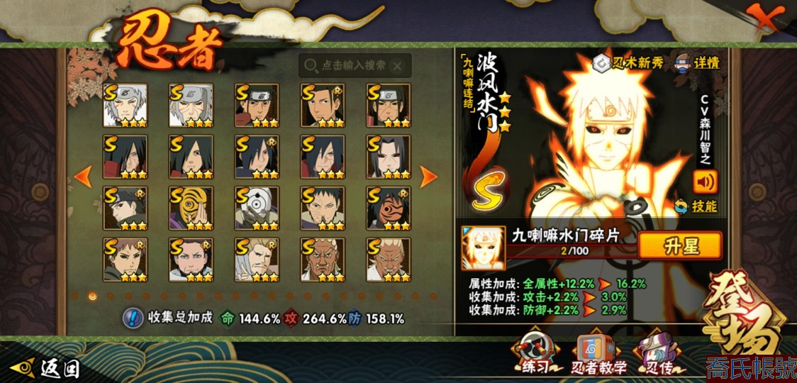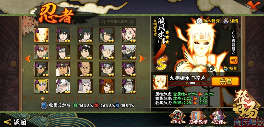 【OBHJPNG946442】戰鬥力:2432W+;段位:中忍2階;本服排名:132;戰區排名:未上榜;VIP13級;S忍51個;A忍52個;通靈獸24個;S忍:大蛇丸(5星),綱手(4星),猿飛日斬(4星),須佐能乎宇智波鼬(4星),天道佩恩(4星),暴怒第六尾漩渦鳴人,九喇嘛連結漩渦鳴人,永恆萬花筒宇智波佐助,忍界大戰春野櫻,須佐能乎旗木卡卡西,自來也,仙人模式自來也,舞之豪傑自來也,傳說中的三忍自來也,百豪綱手,死門邁特凱,波風水門,九喇嘛連結波風水門,穢土轉生波風水門,穢土轉生猿飛日斬,千手扉間,穢土轉生千手扉間,千手柱間,木葉創立千手柱間,穢土轉生千手柱間,穢土轉生宇智波斑,宇智波斑,木葉創立宇智波斑,穢土轉生解宇智波斑,穢土轉生宇智波鼬,須佐能乎宇智波止水,神秘面具男,白面具宇智波斑,忍界大戰宇智波帶土,紅夜之刃神秘面具男,四代目風影羅砂,初代目風影烈鬥,二代目水影鬼燈幻月,四代目雷影艾,忍界大戰艾,三代目雷影艾,三代目土影大野木,二代目土影無,穢土轉生半藏,忍界大戰大野木,超佩恩天道,穢土轉生長門,仙人模式藥師兜,最終章大筒木舍人,大筒木桃式,大筒木金式;A忍:猿飛阿斯瑪(5星),蠍(5星),幹柿鬼鮫(5星),疾風傳我愛羅(4星),飛段(4星),宇智波鼬(3星),死司憑血飛段(3星),仙人模式漩渦鳴人,九尾查克拉漩渦鳴人,萬花筒寫輪眼宇智波佐助,須佐能乎宇智波佐助,宇智波泉奈,百豪春野櫻,忍界大戰秋道丁次,忍界大戰日向寧次,忍界大戰李洛克,幻之真容旗木卡卡西,萬花筒寫輪眼旗木卡卡西,穢土轉生猿飛阿斯瑪,七夕限定猿飛阿斯瑪,地陸,宇智波止水,火影繼承人猿飛日斬,青年波風水門,忍界大戰我愛羅,近松十人衛千代,五代目水影照美冥,桃地再不斬,穢土轉生桃地再不斬,忍界大戰奇拉比,奇拉比,青年艾,半蛇斗篷藥師兜,不緣,青年長門,漂泊浪客佩恩六道,小南,漂泊浪客小南,角都,地怨虞角都,穢土轉生角都,曉大蛇丸,緋流琥蠍,迪達拉,穢土轉生迪達拉,加藤斷,羈絆神農,猿飛木葉丸,桃式顯現漩渦博人,六代目水影長十郎,五代目雷影達魯伊,四代目土影黑土;通靈獸:忍犬,藍蛇,蛤蟆吉,忍龜,鐮鼬,猿魔,山椒魚,蜃,蛤蟆仙人,鮫鯊,蛤蟆健,烏鴉,蛞蝓,砂之守鶴,蛤蟆龍,怒鬼,怒鬼無臂,蛤蟆廣,夢貘,怒鬼爪,鷹,蜘蛛,辛牙;時裝:狂野鮫鯊幹柿鬼鮫,百戰佩恩天道,百戰宇智波鼬須佐能乎,蜀面豪傑舞之豪傑自來也,百戰大蛇丸,百戰波風水門,太極靈韻日向花火武當宗師,智勇記者宇智波佐良娜,驚雷掠影達魯伊五代目雷影,傳說的光芒波風水門,飛瀑流泉長十郎六代目水影,熊貓少女天天峨眉宗師,剎那的藝術迪達拉,驕陽翠羽照美冥夏日泳裝,菁英忍者旗木卡卡西少年,風之守護我愛羅忍界大戰,可愛睡衣漩渦鳴人,土之固守大野木三代目土影,編織虛實宇智波鼬,緋櫻綻放春野櫻百豪,龍的傳人李洛克截拳宗師,睿勇新星千手扉間少年,命定之戰宇智波佐助疾風傳,純白之心白,血霧怪人幹柿鬼鮫,烈土霓裳黑土四代目土影;【217】鴻蒙217區-51s-2435w-v13