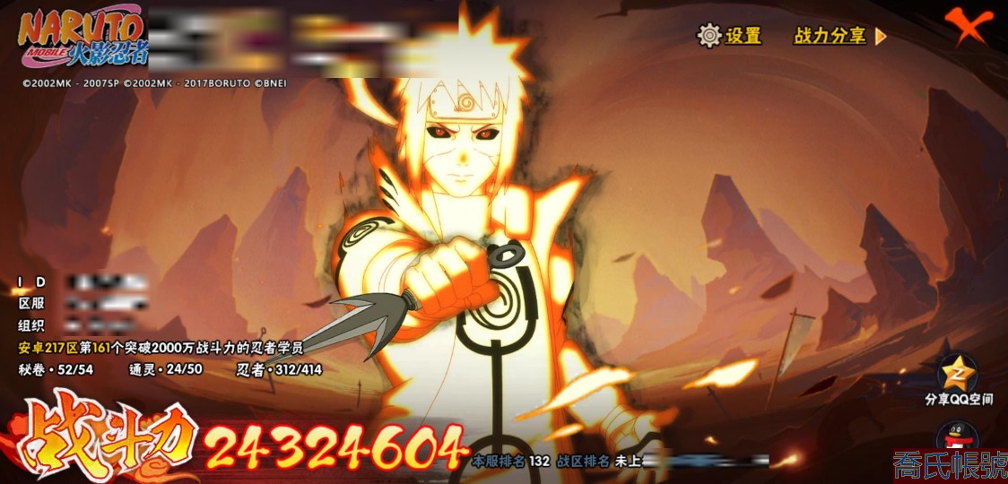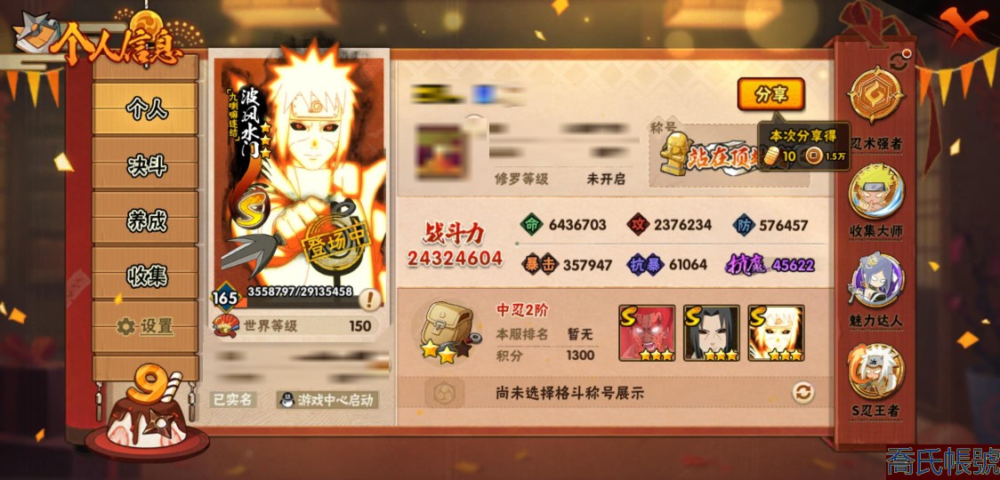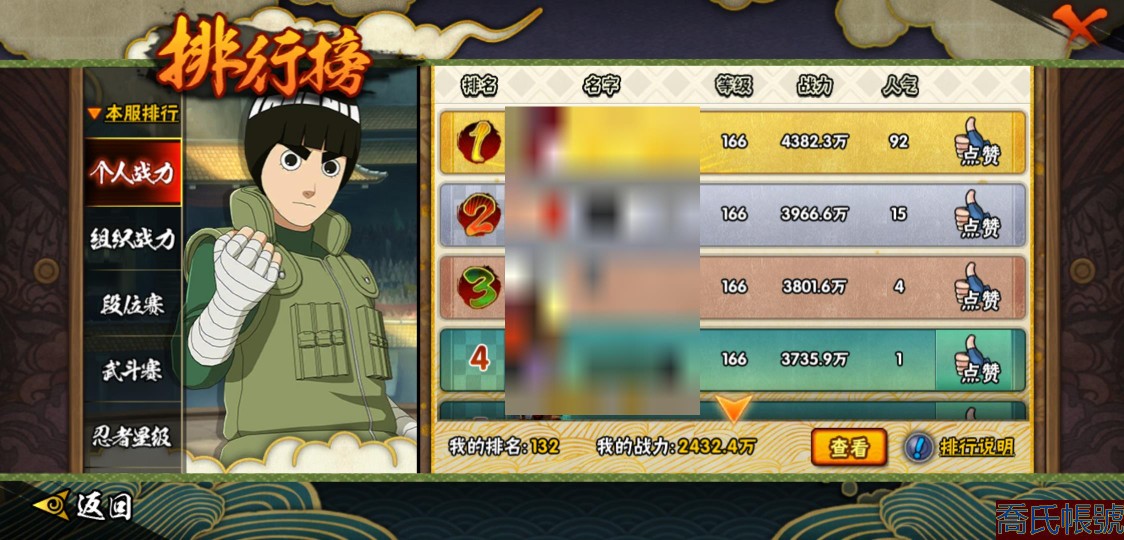 【11等】戰鬥力:2432W+;段位:中忍2階;本服排名:132;戰區排名:未上榜;V