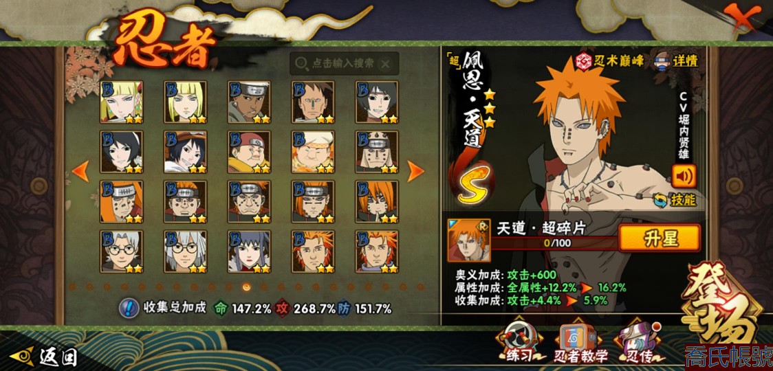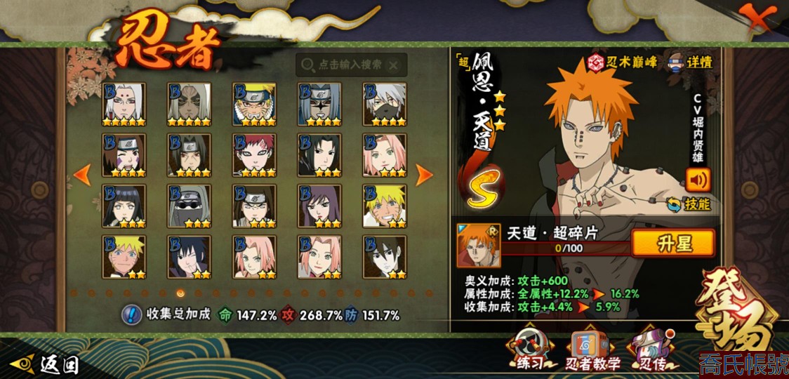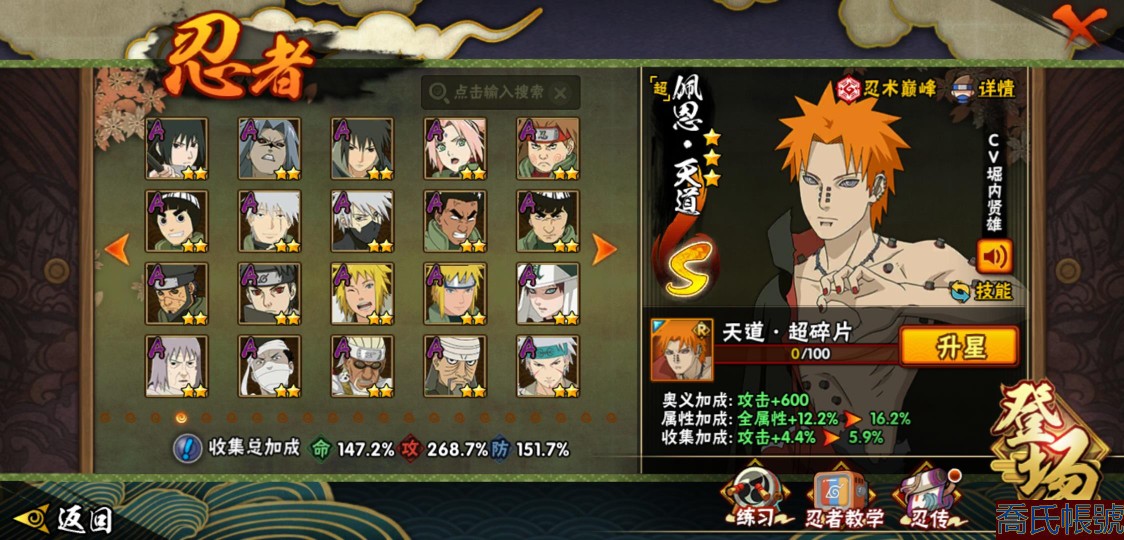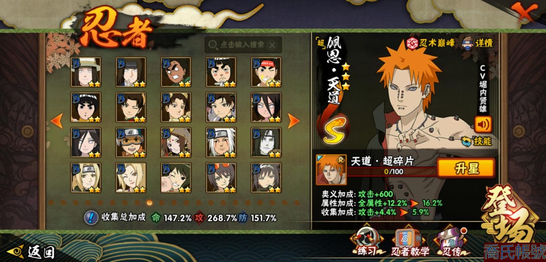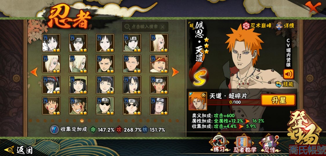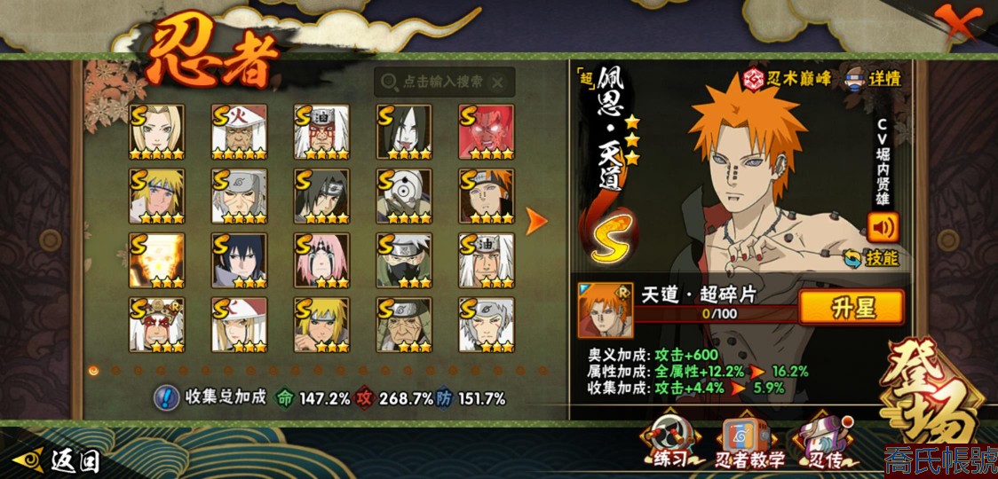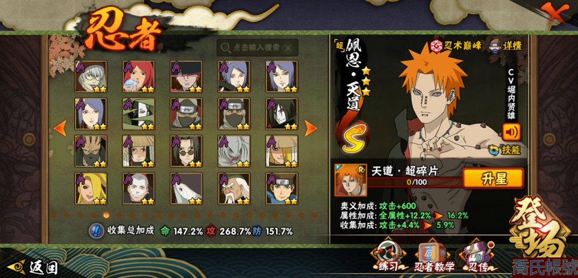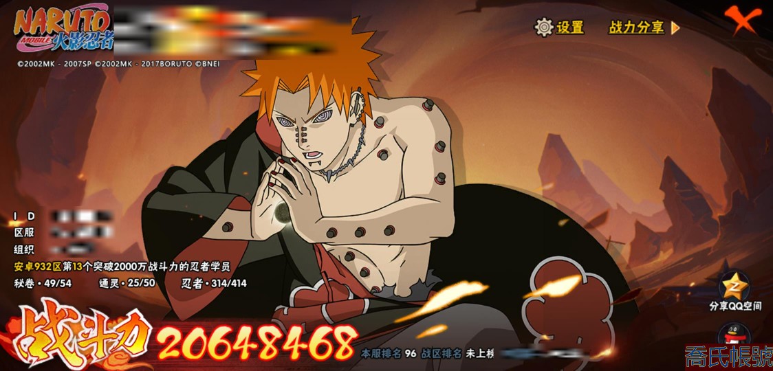 【OBHLLXQ522242】戰鬥力:2064W+;段位:上忍3階;本服排名:9%6;戰區排名:未上榜;VIP14級;S忍44個;A忍58個;通靈獸25個;S忍:綱手(5星),猿飛日斬(5星),仙人模式自來也(4星),大蛇丸(4星),死門邁特凱(4星),波風水門(4星),穢土轉生千手扉間(4星),須佐能乎宇智波鼬(4星),白面具宇智波斑(4星),天道佩恩(4星),九喇嘛連結漩渦鳴人,永恆萬花筒宇智波佐助,忍界大戰春野櫻,須佐能乎旗木卡卡西,自來也,舞之豪傑自來也,百豪綱手,穢土轉生波風水門,穢土轉生猿飛日斬,千手扉間,千手柱間,穢土轉生千手柱間,穢土轉生宇智波斑,宇智波斑,木葉創立宇智波斑,穢土轉生解宇智波斑,穢土轉生宇智波鼬,神秘面具男,忍界大戰宇智波帶土,紅夜之刃神秘面具男,四代目風影羅砂,穢土轉生三代目風影,二代目水影鬼燈幻月,四代目雷影艾,三代目雷影艾,穢土轉生金角銀角,三代目土影大野木,穢土轉生半藏,忍界大戰大野木,二代目土影無,超佩恩天道,穢土轉生長門,仙人模式藥師兜,大筒木金式;A忍:猿飛阿斯瑪(5星),疾風傳我愛羅(5星),蠍(5星),幹柿鬼鮫(5星),飛段(5星),死司憑血飛段(5星),旗木卡卡西(3星),五代目水影照美冥(3星),奇拉比(3星),青年艾(3星),青年長門(3星),五代目雷影達魯伊(3星),仙人模式漩渦鳴人,九尾查克拉漩渦鳴人,萬花筒寫輪眼宇智波佐助,須佐能乎宇智波佐助,疾風傳咒印宇智波佐助,宇智波泉奈,百豪春野櫻,忍界大戰秋道丁次,忍界大戰李洛克,幻之真容旗木卡卡西,萬花筒寫輪眼旗木卡卡西,驚門邁特凱,忍界大戰邁特凱,穢土轉生猿飛阿斯瑪,宇智波止水,新春限定波風水門,青年波風水門,忍界大戰我愛羅,近松十人衛千代,漂泊武士桃地再不斬,忍界大戰奇拉比,三船,漂泊武士千手扉間,半蛇斗篷藥師兜,不風,漂泊浪客佩恩六道,小南,夏日泳裝小南,新春限定小南,絕,角都,地怨虞角都,曉大蛇丸,緋流琥蠍,宇智波鼬,新春限定宇智波鼬,鮫肌融合幹柿鬼鮫,迪達拉,穢土轉生迪達拉,惡靈之影飛段,暴怒宇智波帶土,俠隱江湖大野木,猿飛木葉丸,桃式顯現漩渦博人,六代目水影長十郎,四代目土影黑土;通靈獸:忍犬,藍蛇,蛤蟆吉,忍龜,熊貓,鐮鼬,猿魔,蛞蝓,山椒魚,蛤蟆文太,蜃,蛤蟆仙人,鮫鯊,蛤蟆健,烏鴉,,蛤蟆龍,蛤蟆廣,夢貘,鷹,二尾又旅,砂之守鶴,蜘蛛,萬蛇,怒鬼爪;時裝:狂野鮫鯊幹柿鬼鮫,桀驁之刃猿飛阿斯瑪,百戰波風水門,百戰大蛇丸,蜀面豪傑舞之豪傑自來也,百戰佩恩天道,百戰宇智波鼬須佐能乎,太極靈韻日向花火武當宗師,龍吟浪客千手扉間漂泊武士,土之固守大野木三代目土影,風之守護我愛羅忍界大戰,龍的傳人李洛克截拳宗師,憤怒的伊始宇智波帶土暴怒,驚雷掠影達魯伊五代目雷影,傳說的光芒波風水門,火之意志綱手百豪,夏日衝浪旗木卡卡西元氣夏日,智勇記者宇智波佐良娜,血霧怪人幹柿鬼鮫,初代目火影千手柱間,可愛睡衣漩渦鳴人,雷電之力艾四代目雷影,熊貓少女天天峨眉宗師,編織虛實宇智波鼬,烈土霓裳黑土四代目土影,緋櫻綻放春野櫻百豪,剎那的藝術迪達拉,水之妖姬照美冥五代目水影;【932】全是老忍者很保值