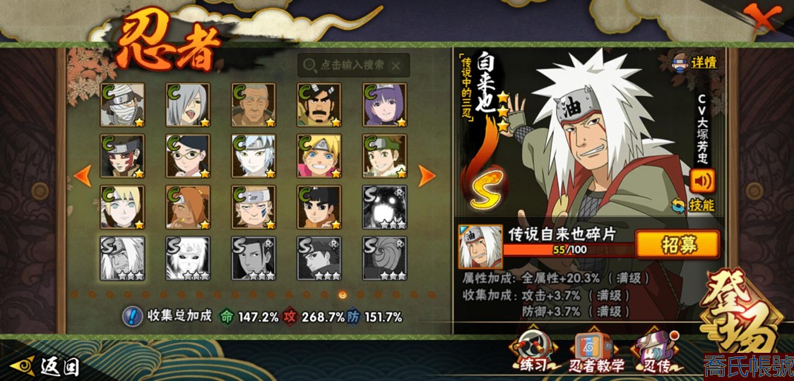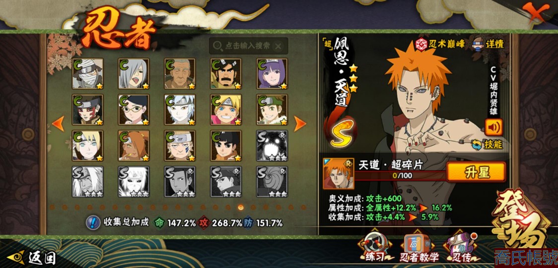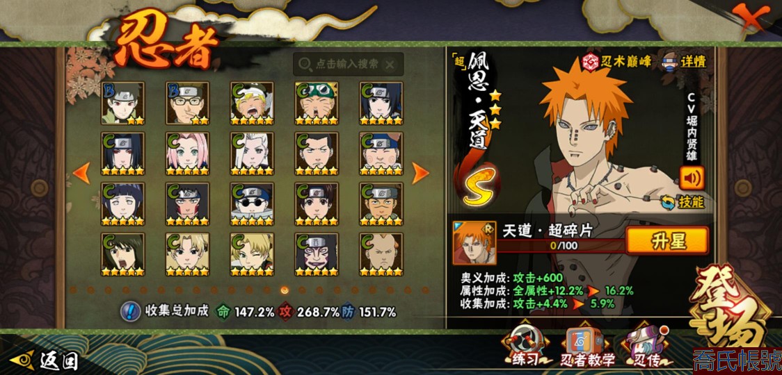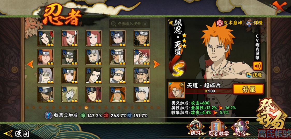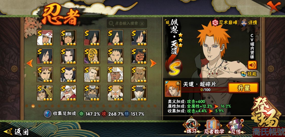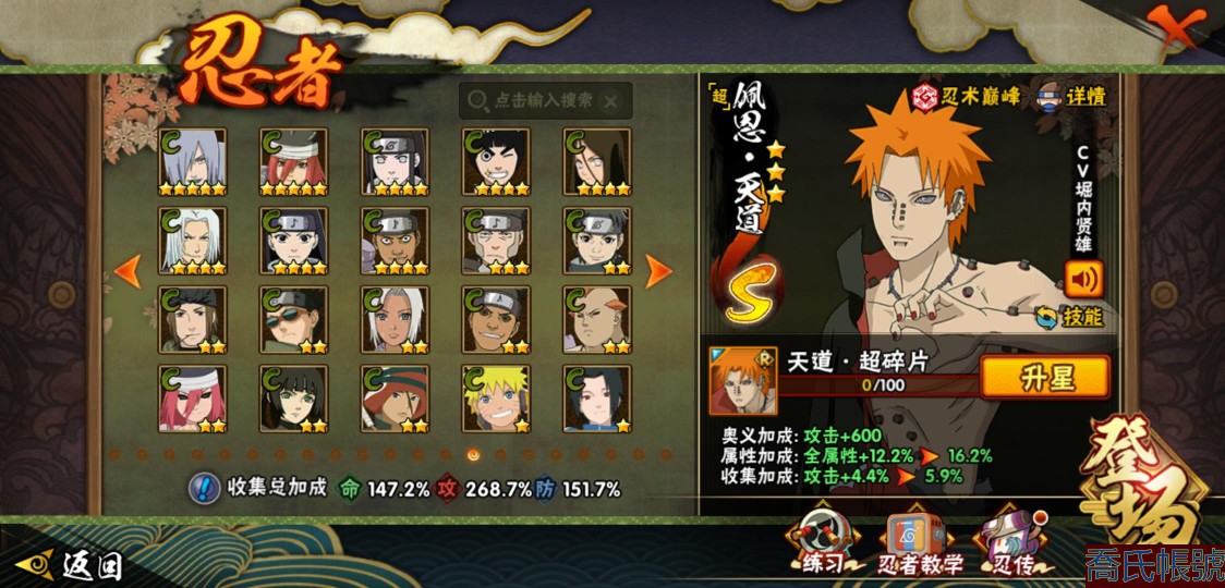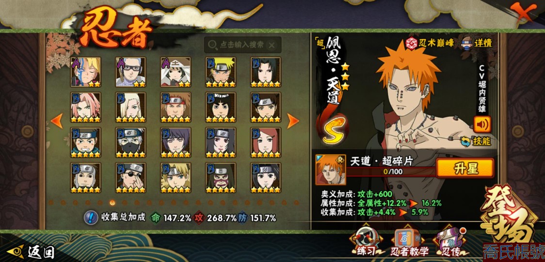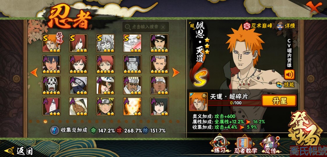 【OBHLLXQ522242】戰鬥力:2064W+;段位:上忍3階;本服排名:9%6;戰區排名:未上榜;VIP14級;S忍44個;A忍58個;通靈獸25個;S忍:綱手(5星),猿飛日斬(5星),仙人模式自來也(4星),大蛇丸(4星),死門邁特凱(4星),波風水門(4星),穢土轉生千手扉間(4星),須佐能乎宇智波鼬(4星),白面具宇智波斑(4星),天道佩恩(4星),九喇嘛連結漩渦鳴人,永恆萬花筒宇智波佐助,忍界大戰春野櫻,須佐能乎旗木卡卡西,自來也,舞之豪傑自來也,百豪綱手,穢土轉生波風水門,穢土轉生猿飛日斬,千手扉間,千手柱間,穢土轉生千手柱間,穢土轉生宇智波斑,宇智波斑,木葉創立宇智波斑,穢土轉生解宇智波斑,穢土轉生宇智波鼬,神秘面具男,忍界大戰宇智波帶土,紅夜之刃神秘面具男,四代目風影羅砂,穢土轉生三代目風影,二代目水影鬼燈幻月,四代目雷影艾,三代目雷影艾,穢土轉生金角銀角,三代目土影大野木,穢土轉生半藏,忍界大戰大野木,二代目土影無,超佩恩天道,穢土轉生長門,仙人模式藥師兜,大筒木金式;A忍:猿飛阿斯瑪(5星),疾風傳我愛羅(5星),蠍(5星),幹柿鬼鮫(5星),飛段(5星),死司憑血飛段(5星),旗木卡卡西(3星),五代目水影照美冥(3星),奇拉比(3星),青年艾(3星),青年長門(3星),五代目雷影達魯伊(3星),仙人模式漩渦鳴人,九尾查克拉漩渦鳴人,萬花筒寫輪眼宇智波佐助,須佐能乎宇智波佐助,疾風傳咒印宇智波佐助,宇智波泉奈,百豪春野櫻,忍界大戰秋道丁次,忍界大戰李洛克,幻之真容旗木卡卡西,萬花筒寫輪眼旗木卡卡西,驚門邁特凱,忍界大戰邁特凱,穢土轉生猿飛阿斯瑪,宇智波止水,新春限定波風水門,青年波風水門,忍界大戰我愛羅,近松十人衛千代,漂泊武士桃地再不斬,忍界大戰奇拉比,三船,漂泊武士千手扉間,半蛇斗篷藥師兜,不風,漂泊浪客佩恩六道,小南,夏日泳裝小南,新春限定小南,絕,角都,地怨虞角都,曉大蛇丸,緋流琥蠍,宇智波鼬,新春限定宇智波鼬,鮫肌融合幹柿鬼鮫,迪達拉,穢土轉生迪達拉,惡靈之影飛段,暴怒宇智波帶土,俠隱江湖大野木,猿飛木葉丸,桃式顯現漩渦博人,六代目水影長十郎,四代目土影黑土;通靈獸:忍犬,藍蛇,蛤蟆吉,忍龜,熊貓,鐮鼬,猿魔,蛞蝓,山椒魚,蛤蟆文太,蜃,蛤蟆仙人,鮫鯊,蛤蟆健,烏鴉,,蛤蟆龍,蛤蟆廣,夢貘,鷹,二尾又旅,砂之守鶴,蜘蛛,萬蛇,怒鬼爪;時裝:狂野鮫鯊幹柿鬼鮫,桀驁之刃猿飛阿斯瑪,百戰波風水門,百戰大蛇丸,蜀面豪傑舞之豪傑自來也,百戰佩恩天道,百戰宇智波鼬須佐能乎,太極靈韻日向花火武當宗師,龍吟浪客千手扉間漂泊武士,土之固守大野木三代目土影,風之守護我愛羅忍界大戰,龍的傳人李洛克截拳宗師,憤怒的伊始宇智波帶土暴怒,驚雷掠影達魯伊五代目雷影,傳說的光芒波風水門,火之意志綱手百豪,夏日衝浪旗木卡卡西元氣夏日,智勇記者宇智波佐良娜,血霧怪人幹柿鬼鮫,初代目火影千手柱間,可愛睡衣漩渦鳴人,雷電之力艾四代目雷影,熊貓少女天天峨眉宗師,編織虛實宇智波鼬,烈土霓裳黑土四代目土影,緋櫻綻放春野櫻百豪,剎那的藝術迪達拉,水之妖姬照美冥五代目水影;【932】全是老忍者很保值