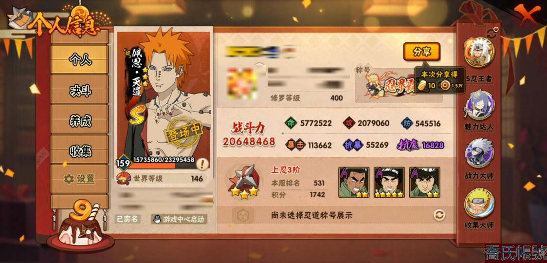 【11等】戰鬥力:2064W+;段位:上忍3階;本服排名:9%6;戰區排名:未上榜;V