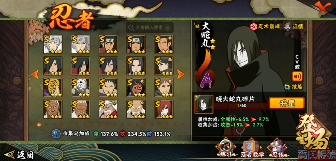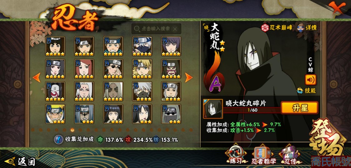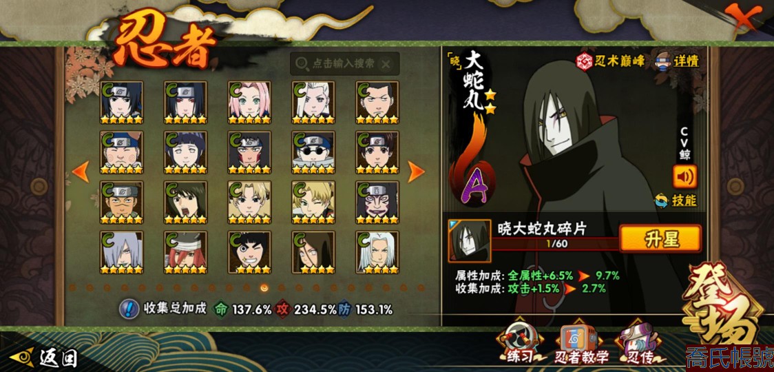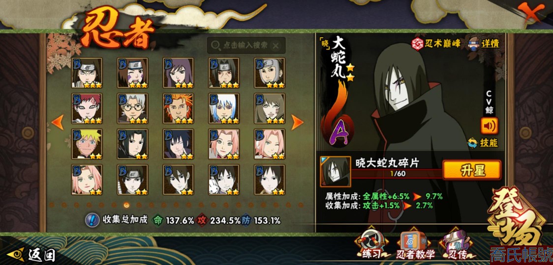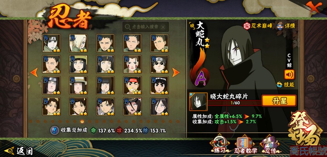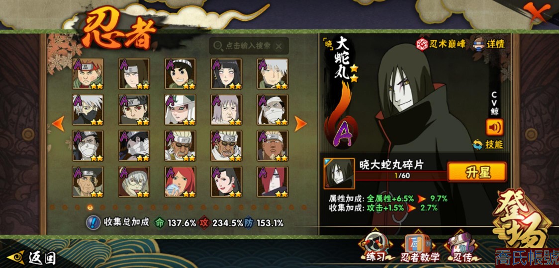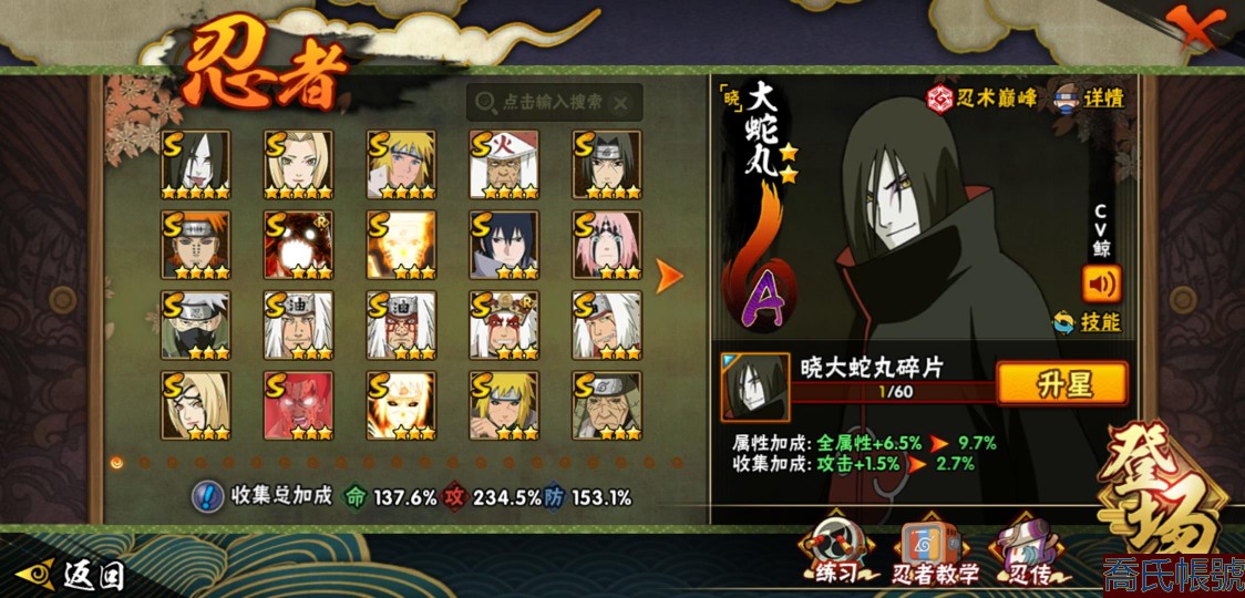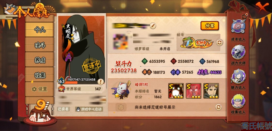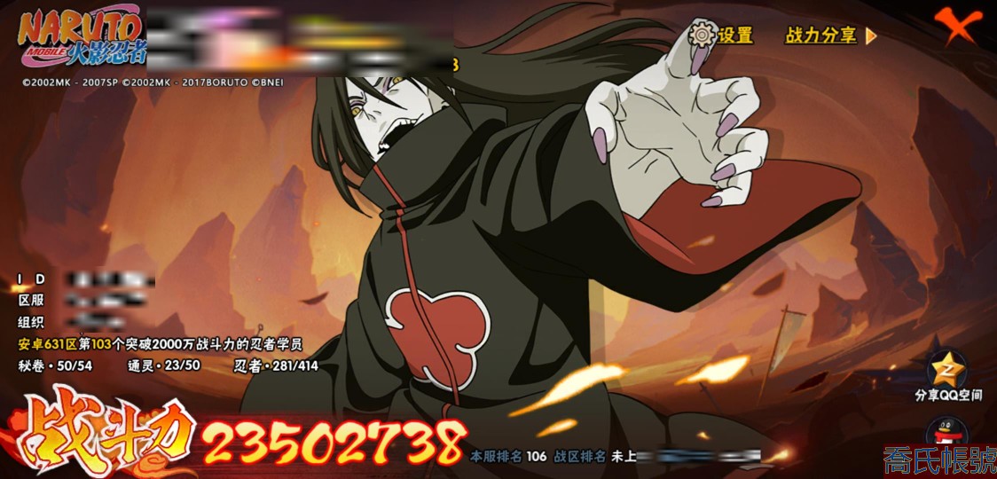 【OBHLLXQ354742】戰鬥力:2350W+;段位:暗部1階;本服排名:106;戰區排名:未上榜;VIP11級;S忍44個;A忍50個;通靈獸23個;S忍:大蛇丸(5星),綱手(5星),波風水門(4星),猿飛日斬(4星),須佐能乎宇智波鼬(4星),天道佩恩(4星),暴怒第六尾漩渦鳴人,九喇嘛連結漩渦鳴人,永恆萬花筒宇智波佐助,忍界大戰春野櫻,須佐能乎旗木卡卡西,自來也,仙人模式自來也,舞之豪傑自來也,傳說中的三忍自來也,百豪綱手,死門邁特凱,九喇嘛連結波風水門,穢土轉生波風水門,穢土轉生猿飛日斬,千手扉間,穢土轉生千手扉間,千手柱間,穢土轉生千手柱間,木葉創立千手柱間,宇智波斑,穢土轉生宇智波斑,穢土轉生解宇智波斑,穢土轉生宇智波鼬,須佐能乎宇智波止水,神秘面具男,白面具宇智波斑,忍界大戰宇智波帶土,紅夜之刃神秘面具男,四代目風影羅砂,四代目雷影艾,忍界大戰艾,三代目土影大野木,忍界大戰大野木,穢土轉生長門,仙人模式藥師兜,最終章大筒木舍人,大筒木桃式,大筒木金式;A忍:猿飛阿斯瑪(5星),蠍(5星),幹柿鬼鮫(5星),疾風傳我愛羅(4星),飛段(4星),仙人模式漩渦鳴人(3星),青年波風水門(3星),五代目水影照美冥(3星),迪達拉(3星),死司憑血飛段(3星),九尾查克拉漩渦鳴人,萬花筒寫輪眼宇智波佐助,須佐能乎宇智波佐助,宇智波泉奈,百豪春野櫻,忍界大戰秋道丁次,忍界大戰日向寧次,忍界大戰李洛克,最終章日向雛田,幻之真容旗木卡卡西,萬花筒寫輪眼旗木卡卡西,宇智波止水,忍界大戰我愛羅,近松十人衛千代,漂泊武士桃地再不斬,桃地再不斬,穢土轉生桃地再不斬,忍界大戰奇拉比,奇拉比,青年艾,忍界大戰土臺,半蛇斗篷藥師兜,不風,不緣,青年長門,小南,角都,地怨虞角都,穢土轉生角都,曉大蛇丸,緋流琥蠍,宇智波鼬,穢土轉生迪達拉,俠隱江湖大野木,羈絆神農,猿飛木葉丸,桃式顯現漩渦博人,六代目水影長十郎,五代目雷影達魯伊,四代目土影黑土;通靈獸:忍犬,藍蛇,蛤蟆吉,忍龜,鐮鼬,猿魔,山椒魚,蜃,蛤蟆仙人,鮫鯊,蛤蟆健,烏鴉,蛤蟆龍,蛞蝓,砂之守鶴,蛤蟆廣,夢貘,鷹,怒鬼爪,蜘蛛,辛牙,怒鬼無臂;時裝:百戰波風水門,百戰宇智波鼬須佐能乎,桀驁之刃猿飛阿斯瑪,蜀面豪傑舞之豪傑自來也,百戰佩恩天道,百戰大蛇丸,太極靈韻日向花火武當宗師,緋櫻綻放春野櫻百豪,土之固守大野木三代目土影,飛瀑流泉長十郎六代目水影,烈土霓裳黑土四代目土影,剎那的藝術迪達拉,編織虛實宇智波鼬,睿勇新星千手扉間少年,智勇記者宇智波佐良娜,血霧怪人幹柿鬼鮫,龍的傳人李洛克截拳宗師,熊貓少女天天峨眉宗師,命定之戰宇智波佐助疾風傳,菁英忍者旗木卡卡西少年,純白之心白,風之守護我愛羅忍界大戰,驚雷掠影達魯伊五代目雷影,可愛睡衣漩渦鳴人,傳說的光芒波風水門;【631】44s 51a