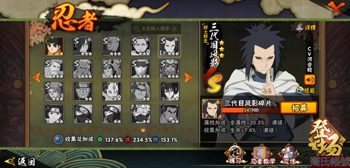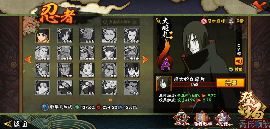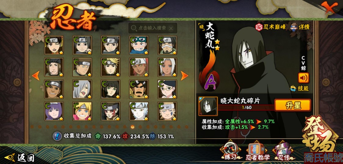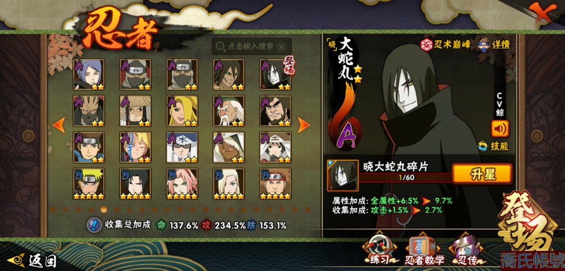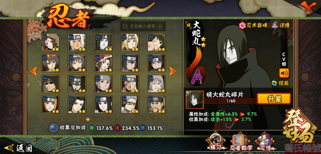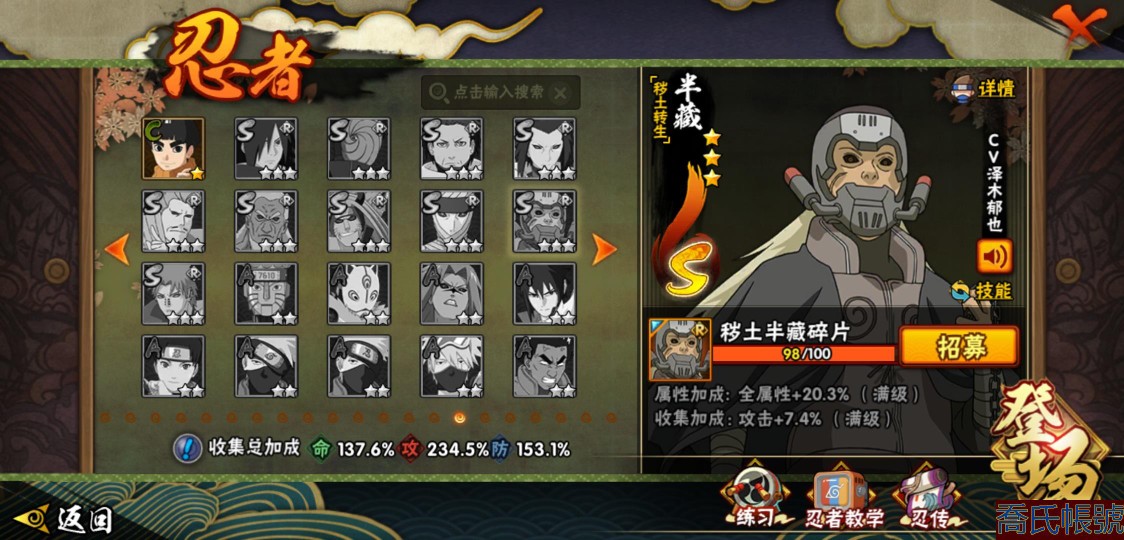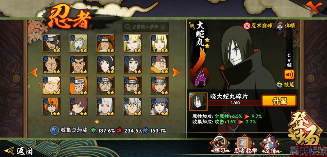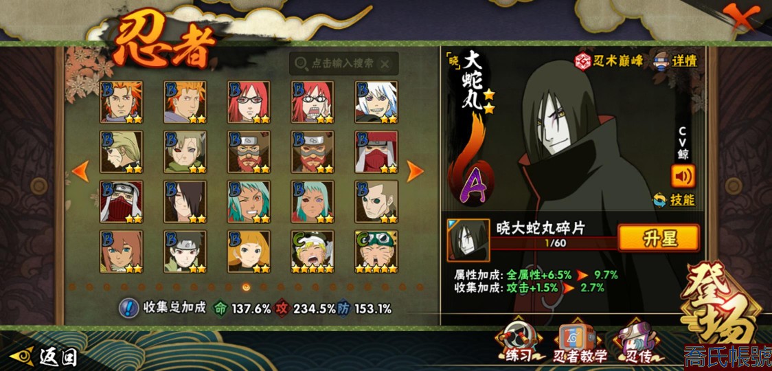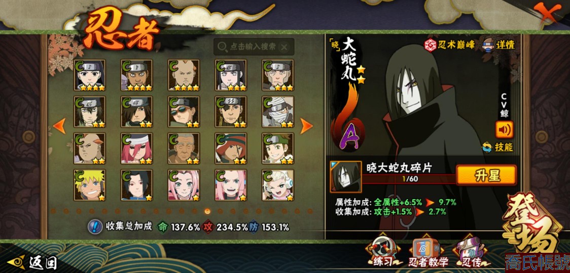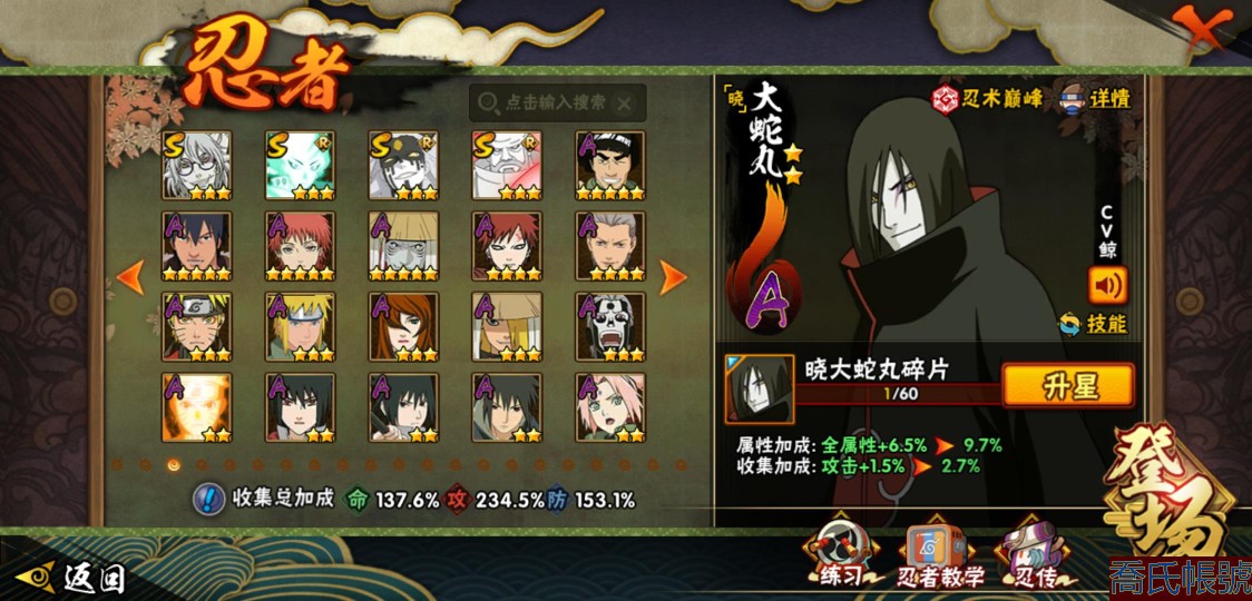 【OBHLLXQ354742】戰鬥力:2350W+;段位:暗部1階;本服排名:106;戰區排名:未上榜;VIP11級;S忍44個;A忍50個;通靈獸23個;S忍:大蛇丸(5星),綱手(5星),波風水門(4星),猿飛日斬(4星),須佐能乎宇智波鼬(4星),天道佩恩(4星),暴怒第六尾漩渦鳴人,九喇嘛連結漩渦鳴人,永恆萬花筒宇智波佐助,忍界大戰春野櫻,須佐能乎旗木卡卡西,自來也,仙人模式自來也,舞之豪傑自來也,傳說中的三忍自來也,百豪綱手,死門邁特凱,九喇嘛連結波風水門,穢土轉生波風水門,穢土轉生猿飛日斬,千手扉間,穢土轉生千手扉間,千手柱間,穢土轉生千手柱間,木葉創立千手柱間,宇智波斑,穢土轉生宇智波斑,穢土轉生解宇智波斑,穢土轉生宇智波鼬,須佐能乎宇智波止水,神秘面具男,白面具宇智波斑,忍界大戰宇智波帶土,紅夜之刃神秘面具男,四代目風影羅砂,四代目雷影艾,忍界大戰艾,三代目土影大野木,忍界大戰大野木,穢土轉生長門,仙人模式藥師兜,最終章大筒木舍人,大筒木桃式,大筒木金式;A忍:猿飛阿斯瑪(5星),蠍(5星),幹柿鬼鮫(5星),疾風傳我愛羅(4星),飛段(4星),仙人模式漩渦鳴人(3星),青年波風水門(3星),五代目水影照美冥(3星),迪達拉(3星),死司憑血飛段(3星),九尾查克拉漩渦鳴人,萬花筒寫輪眼宇智波佐助,須佐能乎宇智波佐助,宇智波泉奈,百豪春野櫻,忍界大戰秋道丁次,忍界大戰日向寧次,忍界大戰李洛克,最終章日向雛田,幻之真容旗木卡卡西,萬花筒寫輪眼旗木卡卡西,宇智波止水,忍界大戰我愛羅,近松十人衛千代,漂泊武士桃地再不斬,桃地再不斬,穢土轉生桃地再不斬,忍界大戰奇拉比,奇拉比,青年艾,忍界大戰土臺,半蛇斗篷藥師兜,不風,不緣,青年長門,小南,角都,地怨虞角都,穢土轉生角都,曉大蛇丸,緋流琥蠍,宇智波鼬,穢土轉生迪達拉,俠隱江湖大野木,羈絆神農,猿飛木葉丸,桃式顯現漩渦博人,六代目水影長十郎,五代目雷影達魯伊,四代目土影黑土;通靈獸:忍犬,藍蛇,蛤蟆吉,忍龜,鐮鼬,猿魔,山椒魚,蜃,蛤蟆仙人,鮫鯊,蛤蟆健,烏鴉,蛤蟆龍,蛞蝓,砂之守鶴,蛤蟆廣,夢貘,鷹,怒鬼爪,蜘蛛,辛牙,怒鬼無臂;時裝:百戰波風水門,百戰宇智波鼬須佐能乎,桀驁之刃猿飛阿斯瑪,蜀面豪傑舞之豪傑自來也,百戰佩恩天道,百戰大蛇丸,太極靈韻日向花火武當宗師,緋櫻綻放春野櫻百豪,土之固守大野木三代目土影,飛瀑流泉長十郎六代目水影,烈土霓裳黑土四代目土影,剎那的藝術迪達拉,編織虛實宇智波鼬,睿勇新星千手扉間少年,智勇記者宇智波佐良娜,血霧怪人幹柿鬼鮫,龍的傳人李洛克截拳宗師,熊貓少女天天峨眉宗師,命定之戰宇智波佐助疾風傳,菁英忍者旗木卡卡西少年,純白之心白,風之守護我愛羅忍界大戰,驚雷掠影達魯伊五代目雷影,可愛睡衣漩渦鳴人,傳說的光芒波風水門;【631】44s 51a
