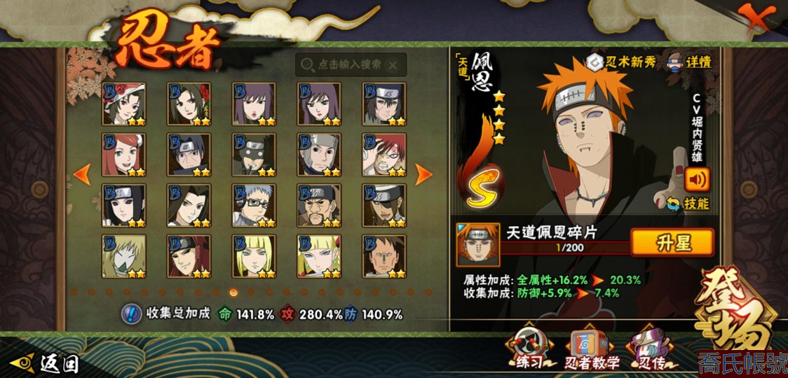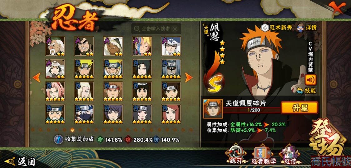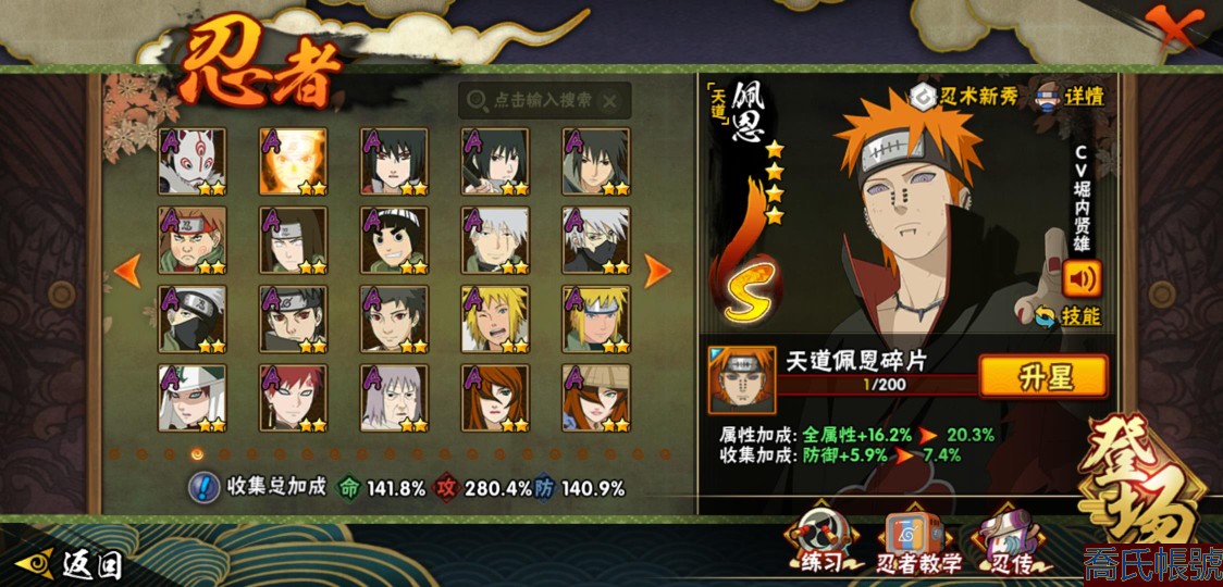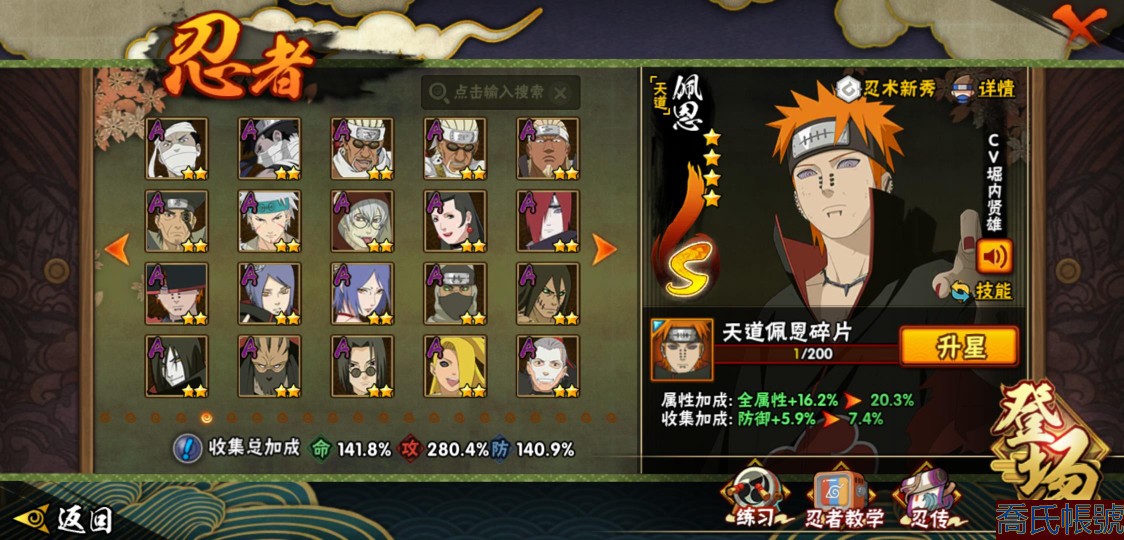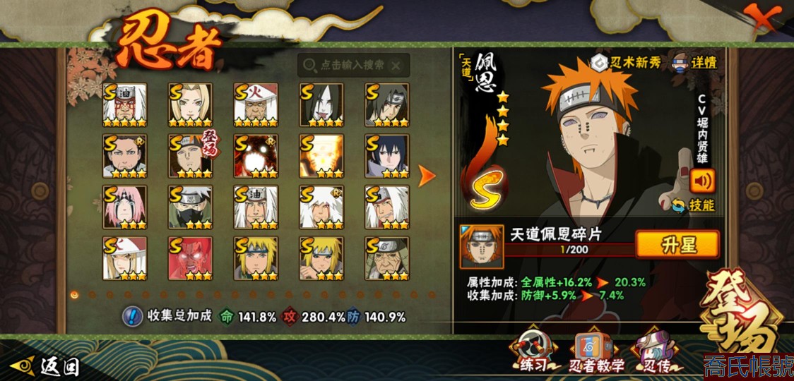 【OBHLLXQ714542】戰鬥力:2737W+;段位:中忍2階;本服排名:5;戰區排名:59;VIP14級;S忍48個;A忍57個;通靈獸32個;S忍:仙人模式自來也(5星),綱手(5星),猿飛日斬(5星),大蛇丸(4星),須佐能乎宇智波鼬(4星),初代目風影烈鬥(4星),天道佩恩(4星),暴怒第六尾漩渦鳴人,九喇嘛連結漩渦鳴人,永恆萬花筒宇智波佐助,忍界大戰春野櫻,須佐能乎旗木卡卡西,自來也,舞之豪傑自來也,傳說中的三忍自來也,百豪綱手,死門邁特凱,波風水門,穢土轉生波風水門,穢土轉生猿飛日斬,千手扉間,穢土轉生千手扉間,穢土轉生千手柱間,木葉創立千手柱間,穢土轉生宇智波斑,木葉創立宇智波斑,穢土轉生解宇智波斑,穢土轉生宇智波鼬,須佐能乎宇智波止水,神秘面具男,白面具宇智波斑,忍界大戰宇智波帶土,紅夜之刃神秘面具男,四代目風影羅砂,二代目水影鬼燈幻月,四代目雷影艾,忍界大戰艾,三代目雷影艾,穢土轉生金角銀角,三代目土影大野木,二代目土影無,穢土轉生半藏,忍界大戰大野木,超佩恩天道,仙人模式藥師兜,最終章大筒木舍人,大筒木桃式,大筒木金式;A忍:猿飛阿斯瑪(5星),疾風傳我愛羅(5星),蠍(5星),幹柿鬼鮫(5星),死司憑血飛段(5星),飛段(4星),旗木卡卡西(3星),宇智波鼬(3星),迪達拉(3星),猿飛木葉丸(3星),仙人模式漩渦鳴人,忍者之路神秘面具男,九尾查克拉漩渦鳴人,萬花筒寫輪眼宇智波佐助,須佐能乎宇智波佐助,宇智波泉奈,忍界大戰秋道丁次,忍界大戰日向寧次,忍界大戰李洛克,幻之真容旗木卡卡西,萬花筒寫輪眼旗木卡卡西,忍界大戰旗木卡卡西,宇智波止水,新春限定宇智波止水,新春限定波風水門,青年波風水門,忍界大戰我愛羅,新春限定我愛羅,近松十人衛千代,五代目水影照美冥,俠隱江湖照美冥,漂泊武士桃地再不斬,穢土轉生桃地再不斬,奇拉比,忍界大戰奇拉比,青年艾,忍界大戰土臺,漂泊武士千手扉間,半蛇斗篷藥師兜,不緣,青年長門,漂泊浪客佩恩六道,小南,漂泊浪客小南,地怨虞角都,穢土轉生角都,曉大蛇丸,緋流琥蠍,新春限定宇智波鼬,穢土轉生迪達拉,惡靈之影飛段,俠隱江湖大野木,羈絆神農,五代目雷影達魯伊,桃式顯現漩渦博人,六代目水影長十郎,四代目土影黑土;通靈獸:忍犬,藍蛇,蛤蟆吉,忍龜,鐮鼬,猿魔,山椒魚,蜃,蛞蝓,蛤蟆仙人,鮫鯊,蛤蟆健,烏鴉,熊貓,二尾又旅,蛤蟆龍,怒鬼,蛤蟆廣,,砂之守鶴,巨型三足鳥,夢貘,萬蛇,怒鬼無臂,鷹,蜘蛛,怒鬼爪,辛牙,鵺,變色龍,祥瑞金烏;時裝:百戰波風水門,百戰宇智波鼬須佐能乎,桀驁之刃猿飛阿斯瑪,鋼鐵之軀邁特凱,蜀面豪傑舞之豪傑自來也,百戰佩恩天道,狂野鮫鯊幹柿鬼鮫,百戰大蛇丸,太極靈韻日向花火武當宗師,龍吟浪客千手扉間漂泊武士,土之固守大野木三代目土影,飛瀑流泉長十郎六代目水影,烈土霓裳黑土四代目土影,火之意志綱手百豪,可愛睡衣漩渦鳴人,血霧怪人幹柿鬼鮫,風之守護我愛羅忍界大戰,傳說的光芒波風水門,剎那的藝術迪達拉,龍的傳人李洛克截拳宗師,命定之戰宇智波佐助疾風傳,菁英忍者旗木卡卡西少年,隱藏內心的面具旗木卡卡西暗部,驚雷掠影達魯伊五代目雷影,編織虛實宇智波鼬,紅月映雪宇智波鼬新春限定,智勇記者宇智波佐良娜,烈火華服宇智波止水新春限定,純白之心白,緋櫻綻放春野櫻百豪,睿勇新星千手扉間少年,熊貓少女天天峨眉宗師;【1507】48s 58a 戰區個人59組織8