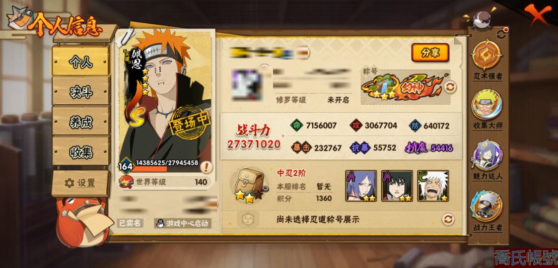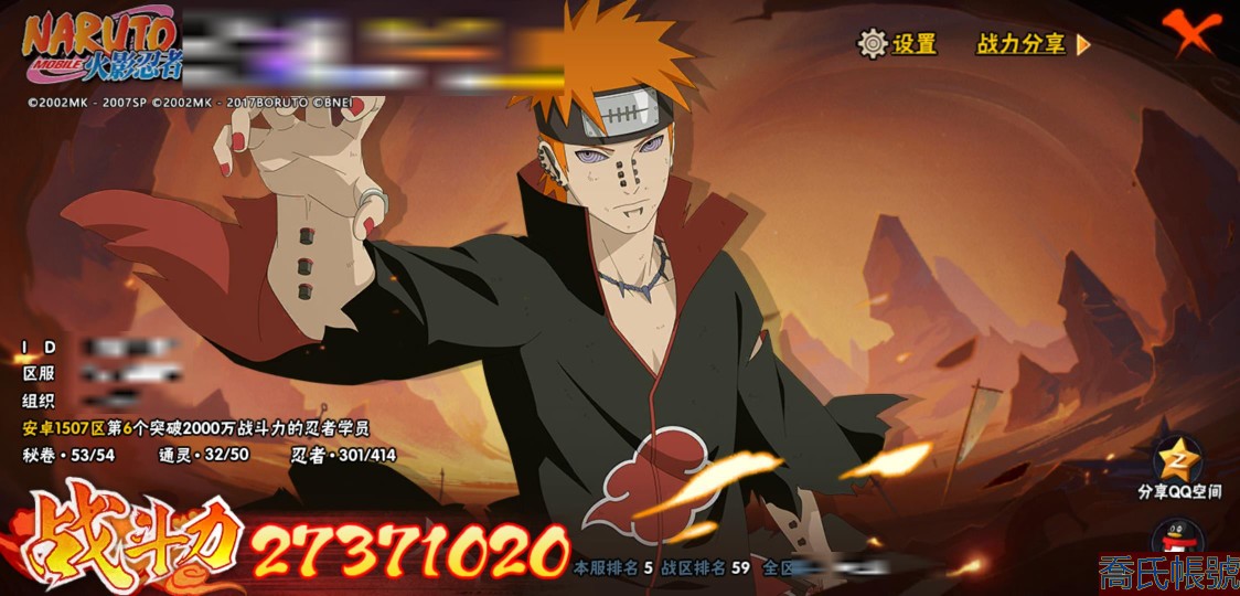 【11等】戰鬥力:2737W+;段位:中忍2階;本服排名:5;戰區排名:59;VIP1