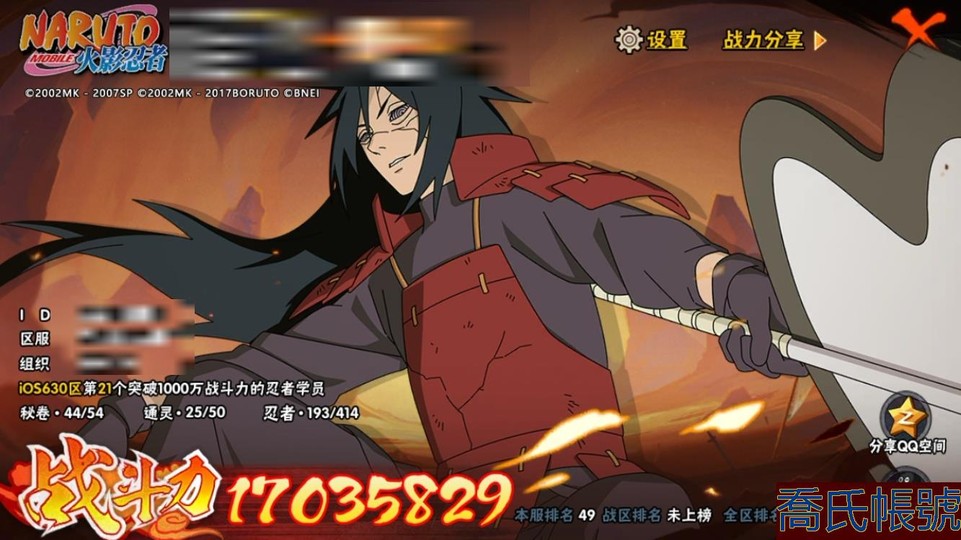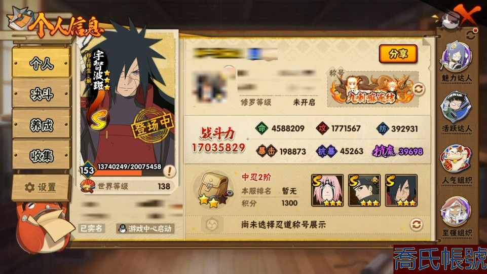【11等】戰鬥力:1703W+;段位:中忍2階;本服排名:49;戰區排名:未上榜;VI