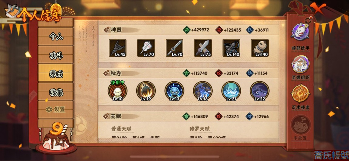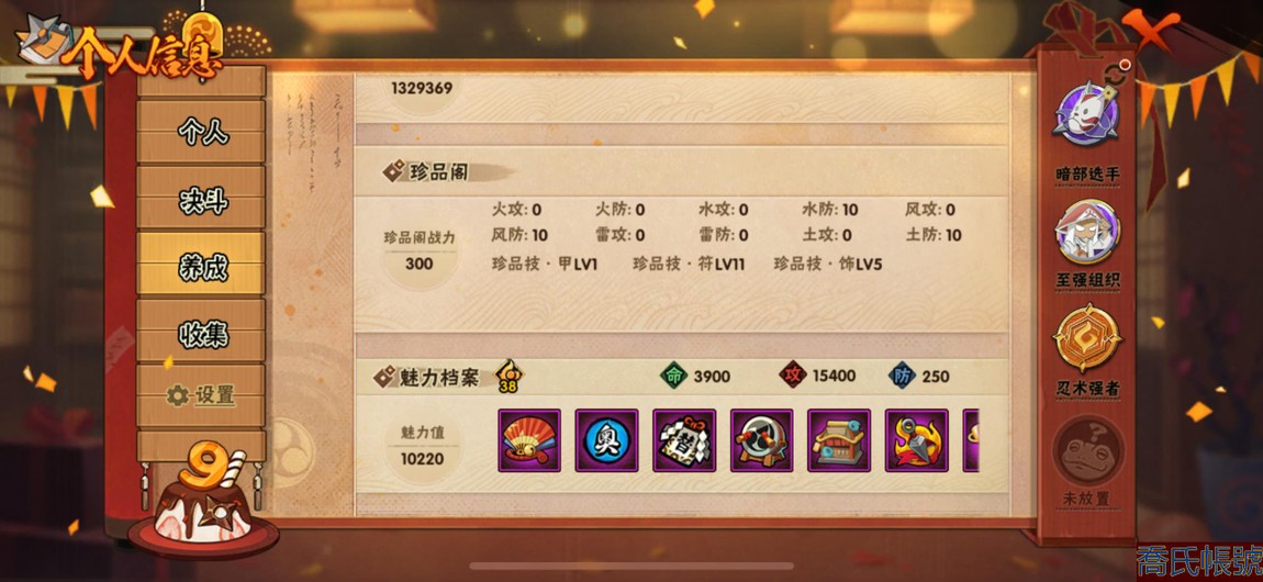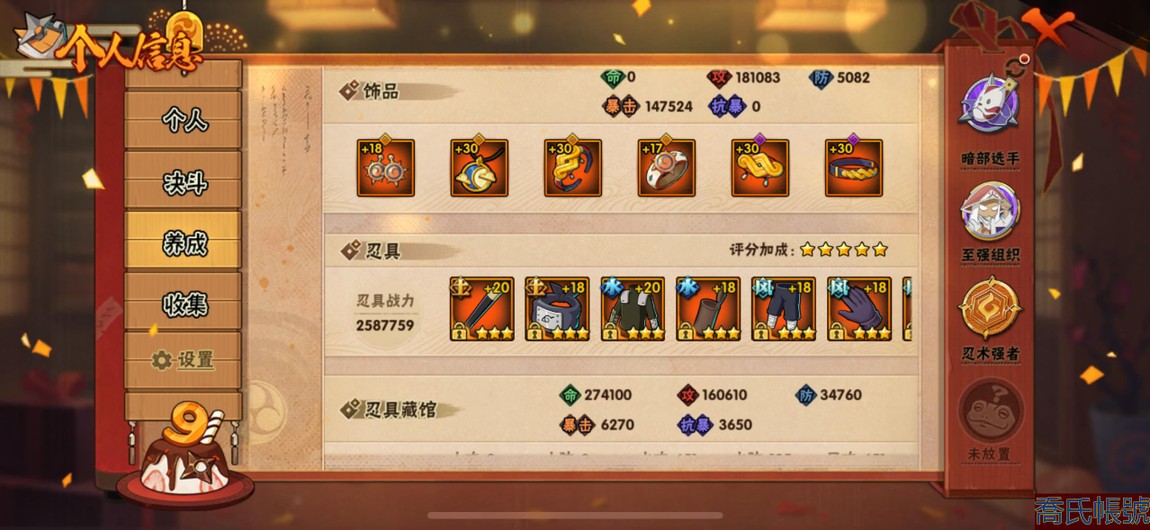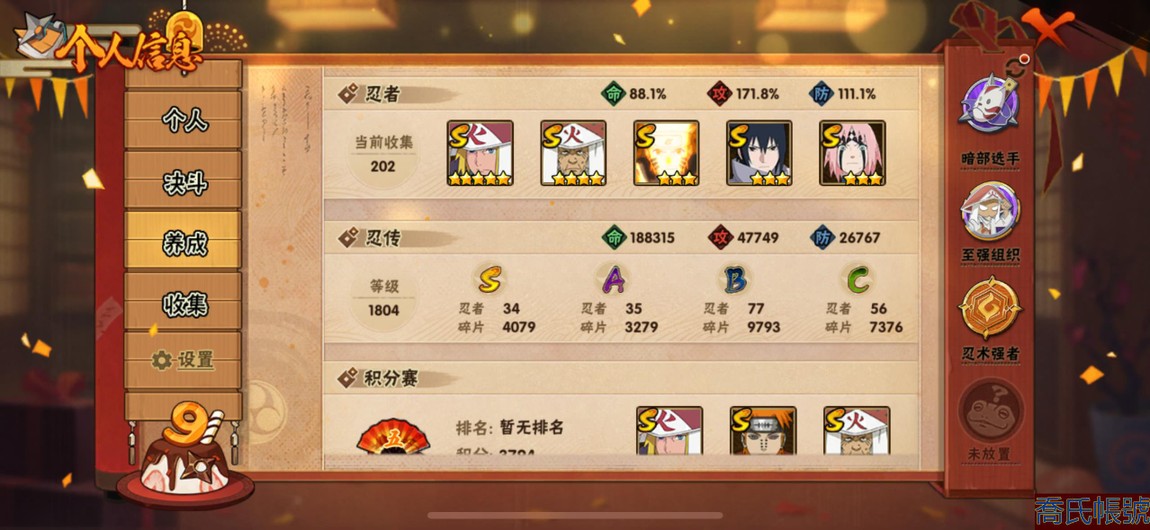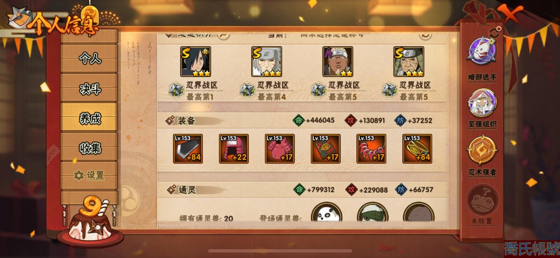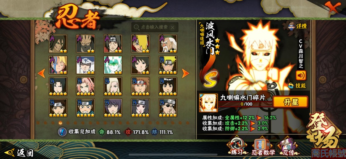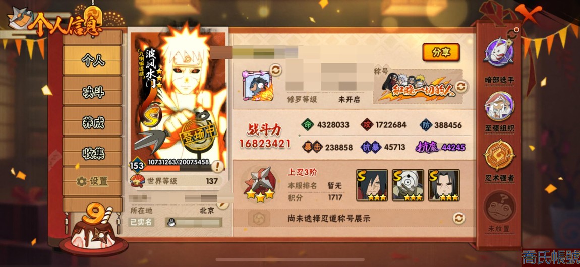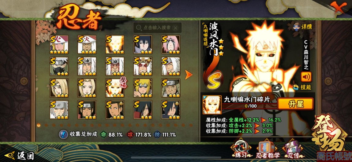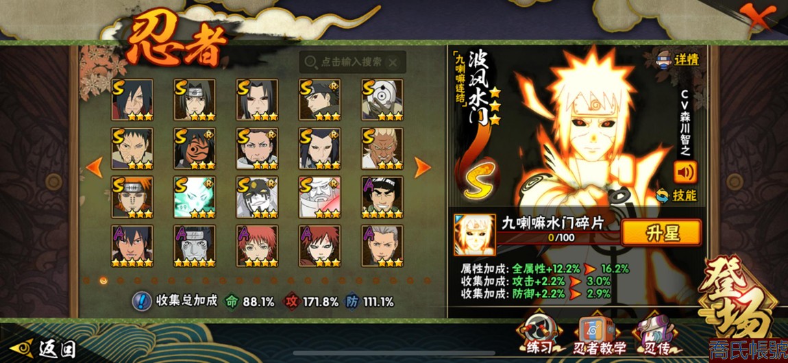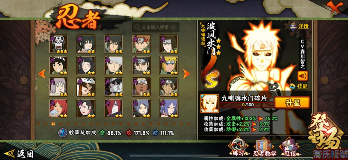 【11等】戰鬥力:1682萬;VIPV13級;S忍34個;A忍36個;S忍:九喇嘛連結