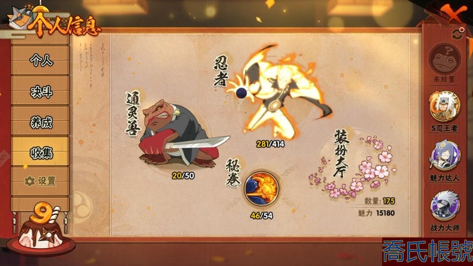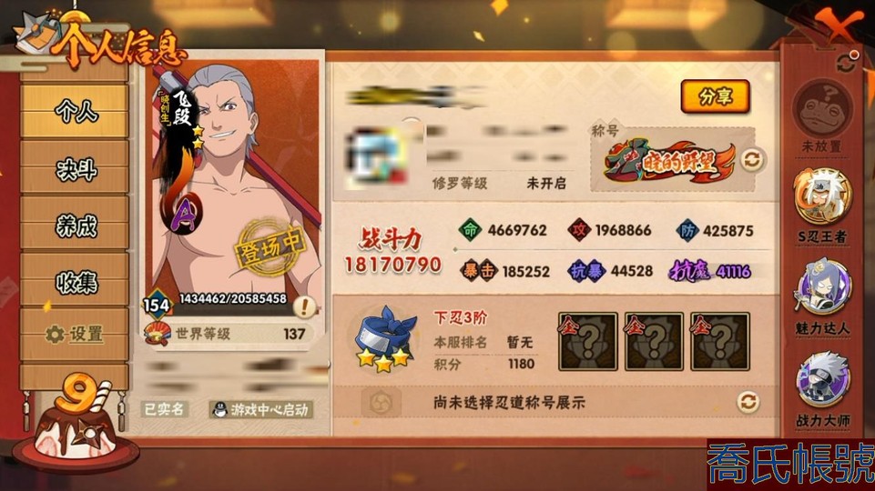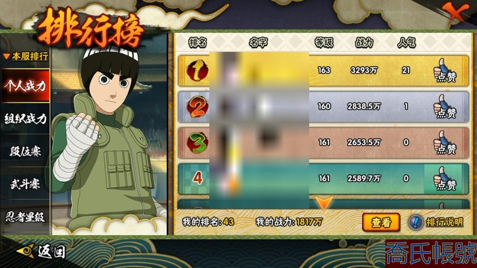 【11等】戰鬥力:1817W+;段位:下忍3階;本服排名:43;戰區排名:未上榜;VI
