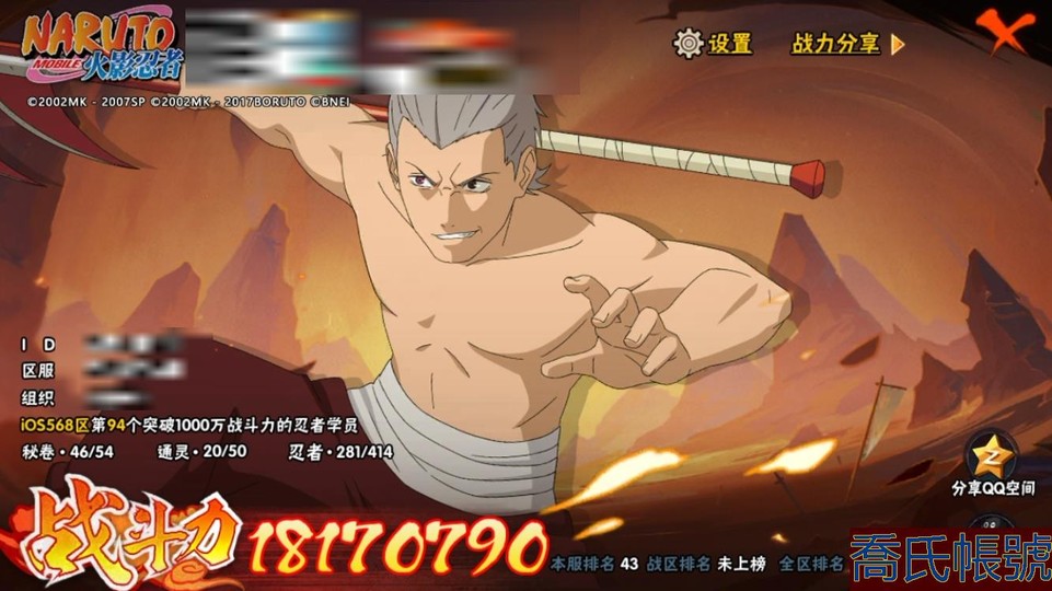 【OBHLLXQ758542】戰鬥力:1817W+;段位:下忍3階;本服排名:43;戰區排名:未上榜;VIP14級;S忍42個;A忍67個;通靈獸20個;S忍:千手柱間,須佐能乎旗木卡卡西,初代目風影烈鬥,忍界大戰大野木,須佐能乎宇智波止水,白面具宇智波斑,穢土轉生波風水門,穢土轉生宇智波斑,猿飛日斬,千手扉間,穢土轉生千手柱間,忍界大戰艾,仙人模式自來也,舞之豪傑自來也,傳說中的三忍自來也,須佐能乎宇智波鼬,二代目水影鬼燈幻月,穢土轉生解宇智波斑,最終章大筒木舍人,永恆萬花筒宇智波佐助,超佩恩天道,四代目風影羅砂,大筒木桃式,綱手,木葉創立千手柱間,忍界大戰春野櫻,百豪綱手,穢土轉生宇智波鼬,神秘面具男,木葉創立宇智波斑,忍界大戰宇智波帶土,死門邁特凱,紅夜之刃神秘面具男,自來也,穢土轉生猿飛日斬,大蛇丸,波風水門,九喇嘛連結漩渦鳴人,大筒木金式,穢土轉生千手扉間,天道佩恩,仙人模式藥師兜;A忍:猿飛阿斯瑪,蠍,幹柿鬼鮫,疾風傳我愛羅,飛段,死司憑血飛段,忍者之路神秘面具男,九尾查克拉漩渦鳴人,萬花筒寫輪眼宇智波佐助,須佐能乎宇智波佐助,疾風傳咒印宇智波佐助,宇智波泉奈,忍界大戰秋道丁次,忍界大戰日向寧次,忍界大戰李洛克,最終章日向雛田,幻之真容旗木卡卡西,旗木卡卡西,萬花筒寫輪眼旗木卡卡西,忍界大戰旗木卡卡西,驚門邁特凱,穢土轉生猿飛阿斯瑪,地陸,宇智波止水,新春限定宇智波止水,新春限定波風水門,青年波風水門,新春限定我愛羅,近松十人衛千代,五代目水影照美冥,俠隱江湖照美冥,桃地再不斬,漂泊武士桃地再不斬,穢土轉生桃地再不斬,奇拉比,青年艾,忍界大戰土臺,俠隱江湖綱手,漂泊武士千手扉間,俠隱江湖藥師兜,不風,不緣,青年長門,漂泊浪客佩恩六道,小南,夏日泳裝小南,漂泊浪客小南,絕,角都,穢土轉生角都,曉大蛇丸,緋流琥蠍,曉創生蠍,宇智波鼬,新春限定宇智波鼬,鮫肌融合幹柿鬼鮫,迪達拉,穢土轉生迪達拉,新春限定迪達拉,阿飛,曉創生飛段,暴怒宇智波帶土,漂泊浪客宇智波帶土,桃式顯現漩渦博人,六代目水影長十郎,五代目雷影達魯伊,四代目土影黑土;通靈獸:忍犬,藍蛇,蛤蟆吉,忍龜,鐮鼬,猿魔,砂之守鶴,山椒魚,蜃,熊貓,蛤蟆仙人,蛞蝓,鮫鯊,蛤蟆健,烏鴉,蛤蟆龍,蛤蟆廣,夢貘,鷹,蜘蛛;時裝:百戰大蛇丸,百戰波風水門,百戰佩恩天道,百戰宇智波鼬須佐能乎,太極靈韻日向花火武當宗師,滄瀾狂侍佩恩·六道漂泊浪客,晨昏神使小南漂泊浪客,冷玉豪情綱手俠隱江湖,剎寂鬼人桃地再不斬漂泊武士,龍吟浪客千手扉間漂泊武士,龍的傳人李洛克截拳宗師,命定之戰宇智波佐助疾風傳,土之固守大野木三代目土影,血霧怪人幹柿鬼鮫,睿勇新星千手扉間少年,熊貓少女天天峨眉宗師,風之守護我愛羅忍界大戰,剎那的藝術迪達拉,智勇記者宇智波佐良娜,千雪霜華照美冥俠隱江湖,菁英忍者旗木卡卡西少年,烈土霓裳黑土四代目土影,憤怒的伊始宇智波帶土暴怒,驚雷掠影達魯伊五代目雷影,飛瀑流泉長十郎六代目水影,緋櫻綻放春野櫻百豪,傳說的光芒波風水門;【568】【蘋果QQ】
