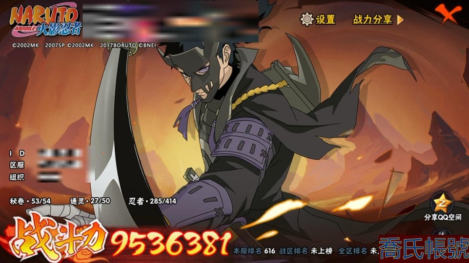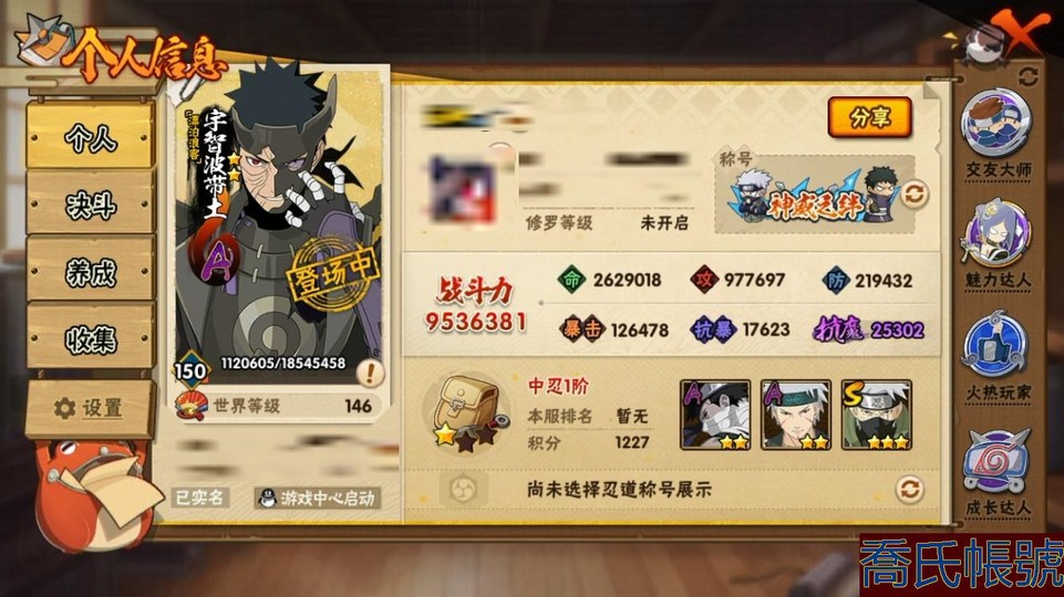 【11等】戰鬥力:953W+;段位:中忍1階;本服排名:616;戰區排名:未上榜;VI