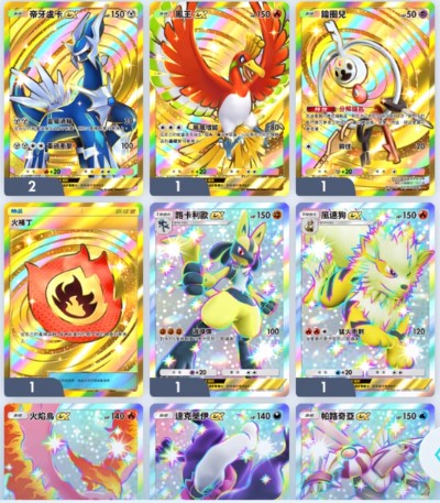 | 成品豪华版 | 13皇冠卡:( 飛魚1鳳1洛奇亞1宙斯1水龍1鋼龙1露奈雅拉1雷歐1噴1夢1皮1超 精靈球) 2星闪卡32張:(3黑噴3路歐2地鼠1大針蜂2陸鲨3化石翼龙1风速狗1时拉比1帕奇利兹等) 24實鏡卡(1水君1鳳2洛奇亞1伊布4古茲馬2莉莉艾2鬼龙2宙斯1帕2帝2時1皮2超1夢) 其他:193二星卡+265一星卡+165四棱卡+307張p卡【總卡12993+57开包沙漏+141金块】 | ||||
