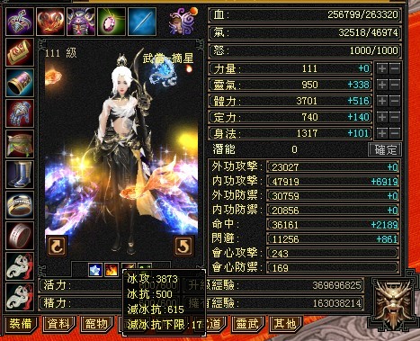 冰攻3873 玄1050 毒573 冰減615 會心285 會防190
