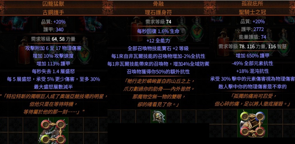 孤寂庇所.聖騎士之冠、骨融.理石護身符(瓦爾召喚物)囚籠猛獸.古鋼護手(盛怒)