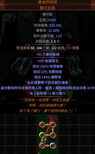 PoE👍傳奇6L→黃金詐術師.獅爪巨劍 (神殿增益效果、每2點智慧增加1魔力)