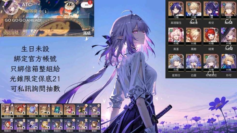 【男、70等、11金角、6金專】6+1大黑塔0+1緹寶0+0萬敵希兒風堇星期日