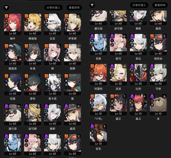 ✨絕區零亞服開服號-伊芙琳5+1,柳1命,儀玄0+1,星見雅0+1,橘福福,柚葉,耀嘉音,菜特,朱鳶,悠真,{1命:萊卡恩+麗娜}格莉絲2命等,共36+金,男主,絕區零國際服亞服成品號