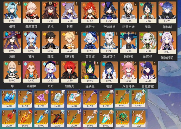 【男、60等、26金角、18金武】🔥原神3限定滿命+專 6+4優菈 6+1傘兵 6+1八重 多限定角色+專