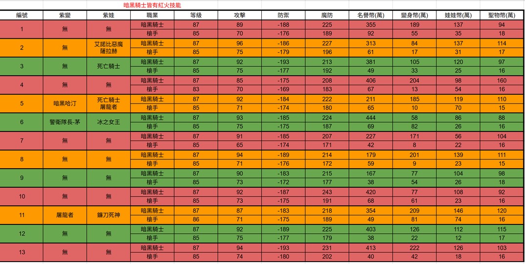 | 編號 | 紫變 | 紫娃 | 職業 | 等級 | 攻擊 | 防禦 | 魔防 | 名譽幣(萬) | 變身幣(萬) | 娃娃幣(萬) | 聖物幣(萬) |