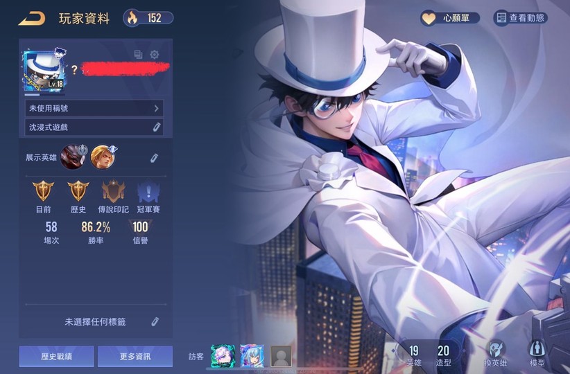 【Garena帳有綁定、黃金、V2、19英、20造】基德 柯南 皆全套 紫苑