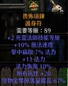 項鍊:2死靈10高施11法力+法力恢復10%+20全抗67錢(89級) 240