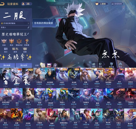 【Garena帳無綁無連、星耀、V5、40英、57造】高勝/璀璨/單冠王/五條悟/基德/捷星/皆全套/覺醒刀鋒V/奔雷神使/災厄之眼/