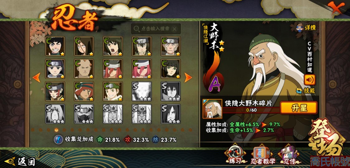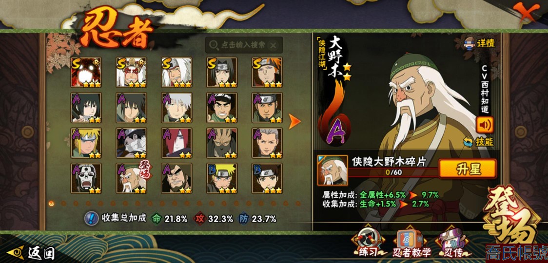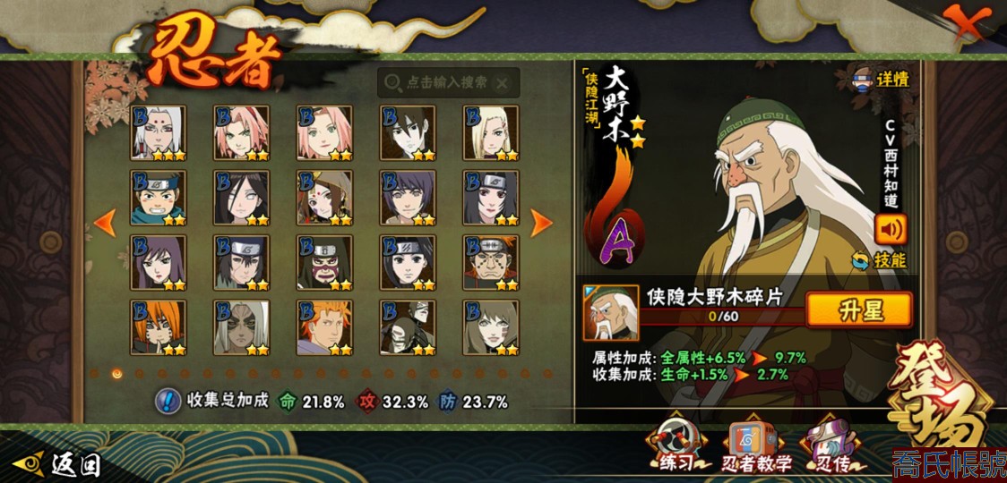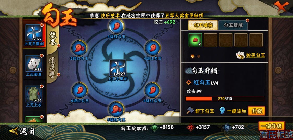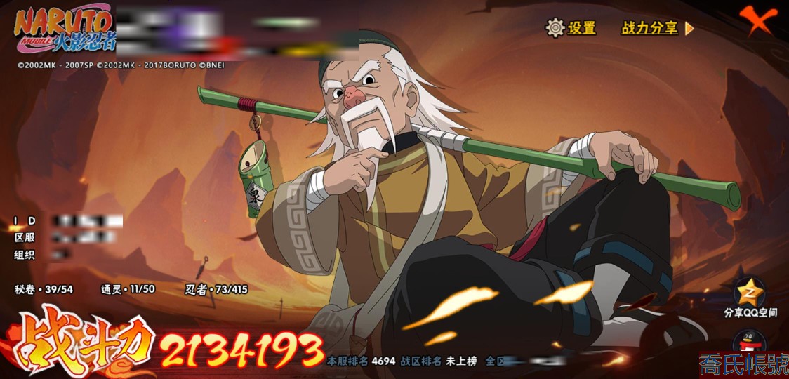【OBHXDNK038542】戰鬥力:213W+;段位:上忍1階;本服排名:4694;戰區排名:未上榜;VIP8級;S忍5個;A忍13個;通靈獸11個;S忍:暴怒第六尾漩渦鳴人,舞之豪傑自來也,傳說中的三忍自來也,須佐能乎宇智波鼬,天道佩恩;A忍:須佐能乎宇智波佐助,宇智波泉奈,幻之真容旗木卡卡西,邁特凱,猿飛阿斯瑪,青年波風水門,穢土轉生桃地再不斬,青年長門,緋流琥蠍,飛段,死司憑血飛段,俠隱江湖大野木,羈絆神農;通靈獸:忍犬,藍蛇,蛤蟆吉,忍龜,鐮鼬,砂之守鶴,猿魔,山椒魚,蛞蝓,蜃,蛤蟆仙人;時裝:蜀面豪傑舞之豪傑自來也,百戰佩恩天道,百戰宇智波鼬須佐能乎,太極靈韻日向花火武當宗師,緋櫻綻放春野櫻百豪;【3085】